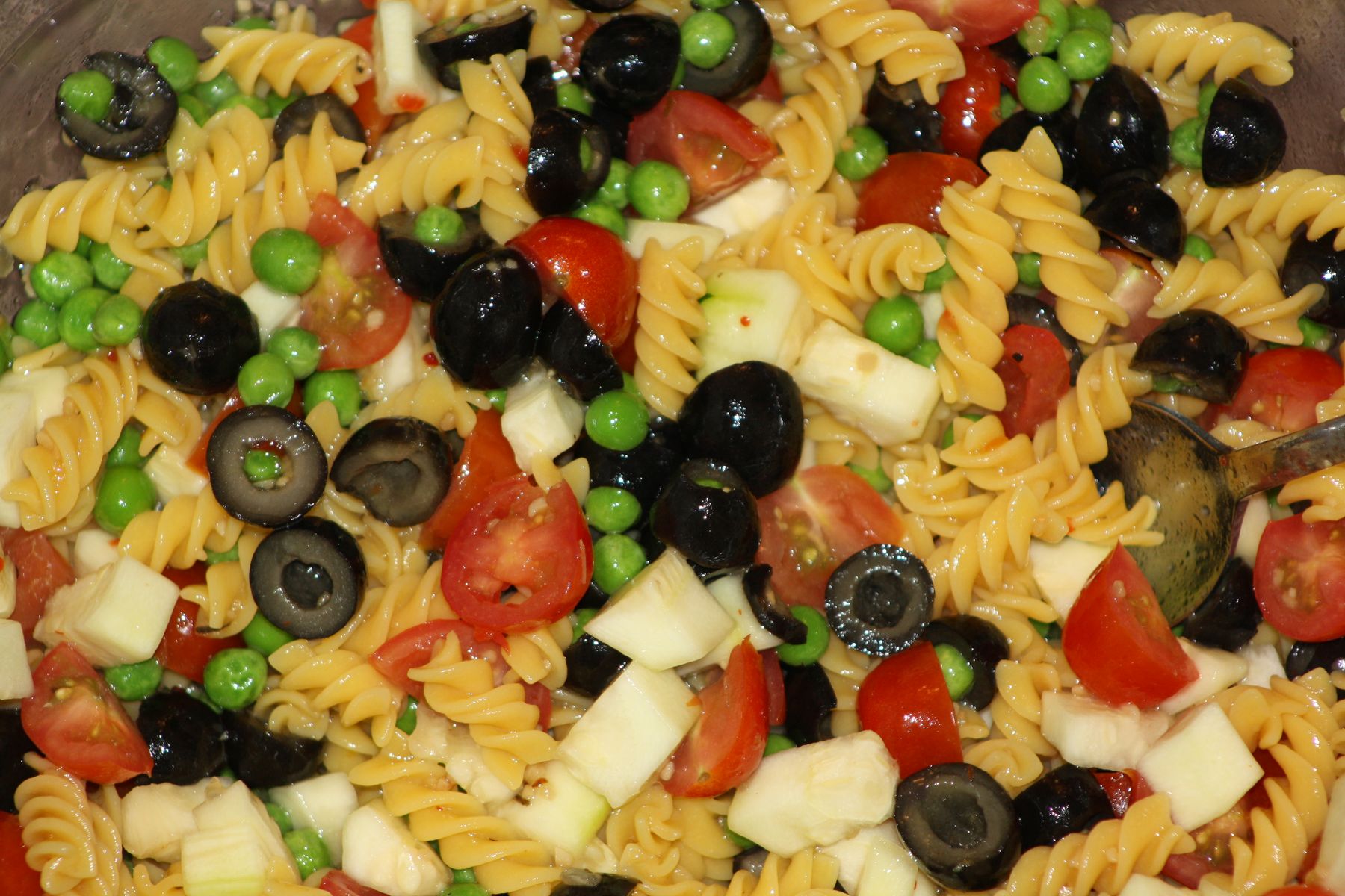 Cook pasta (do not overcook). Drain well and place in bowl. Slice zucchini, olives and tomatoes. Add to pasta. Rinse peas and add. Add dressing and toss. Cover and chill 2 hours before serving