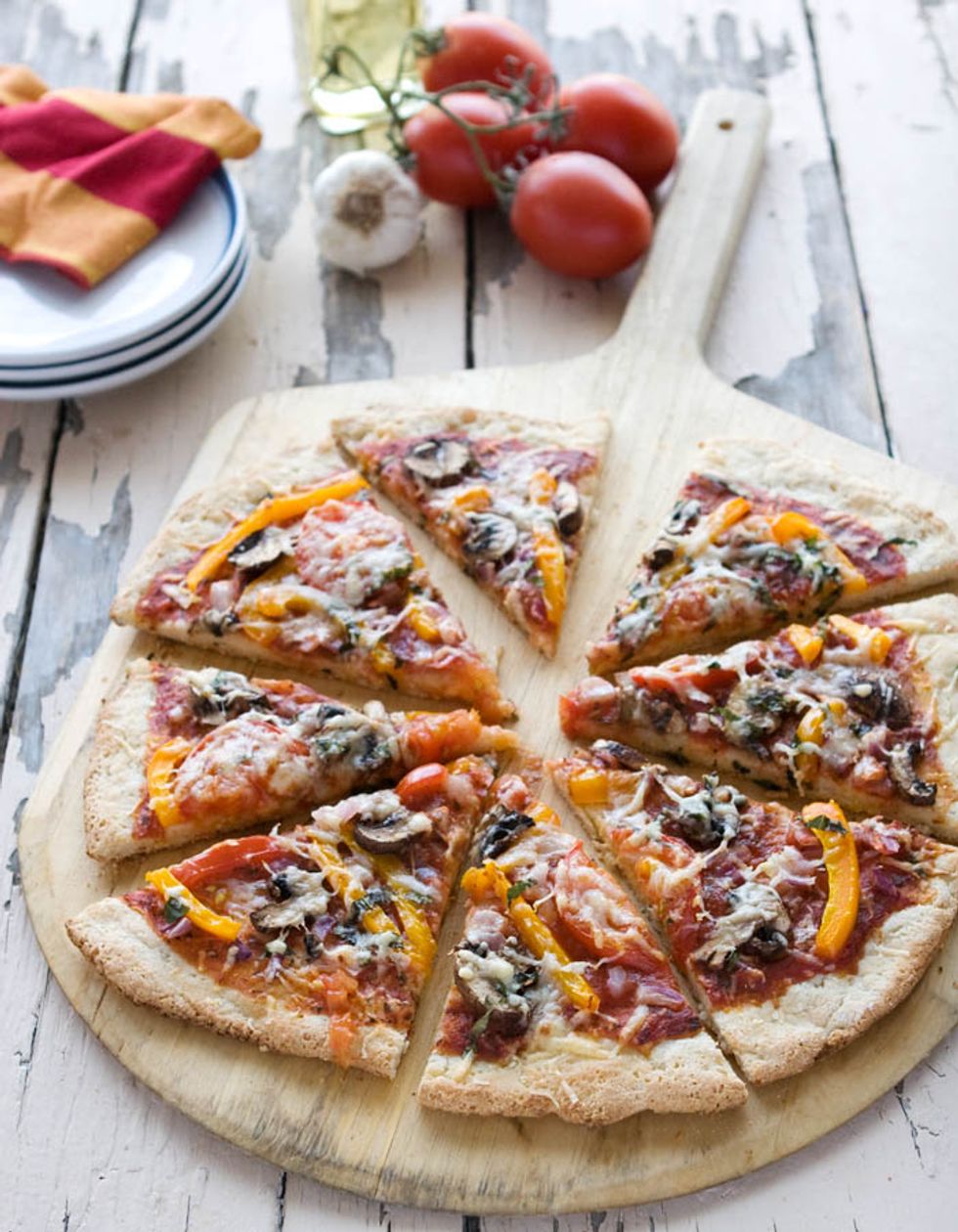 Fresh summer veggies on top of a homemade crispy, crunchy gluten free pizza crust.