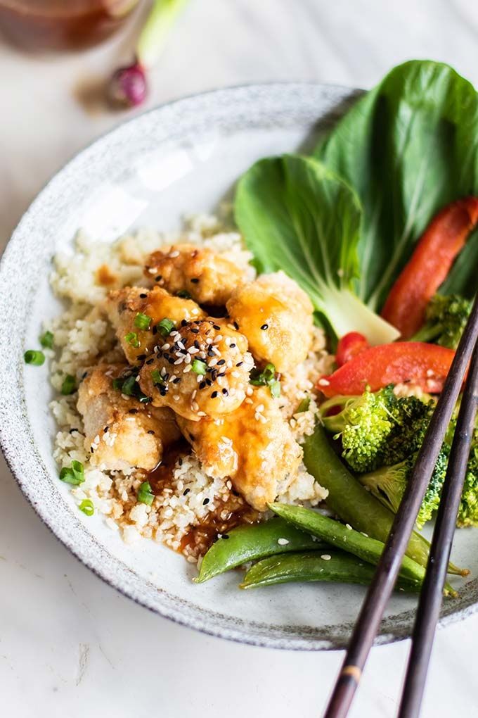 A healthy Gluten Free Sweet and Sour Chicken recipe, baked on a sheet pan loaded with Asian style veggies. The homemade sweet and sour sauce is sweet, tangy, and flavor packed, while also lower in sugar and sodium than a restaurant version. Healthy take-out at home, with an easy chicken sheet pan dinner!