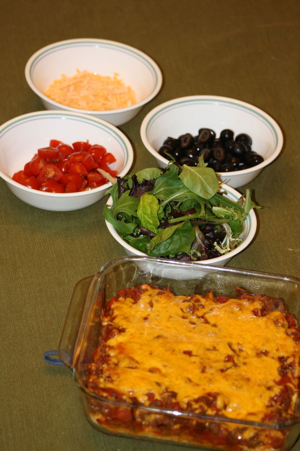 In bowl combine cornmeal, flour, baking powder and salt. Add butter and cut into flour mixture until pea sized dough appears. Add milk and mix well. Press into bottom of 9x13 pan. Bake 400 for 10 mins. Cool. Brown sausage. Drain. Stir in spaghetti sauce, tomatoes, taco seasoning and water, bring to a boil. Simmer. Sprinkle meat and cheese over crust. Bake 400 for 15 mins. Top with remaining ingredients.