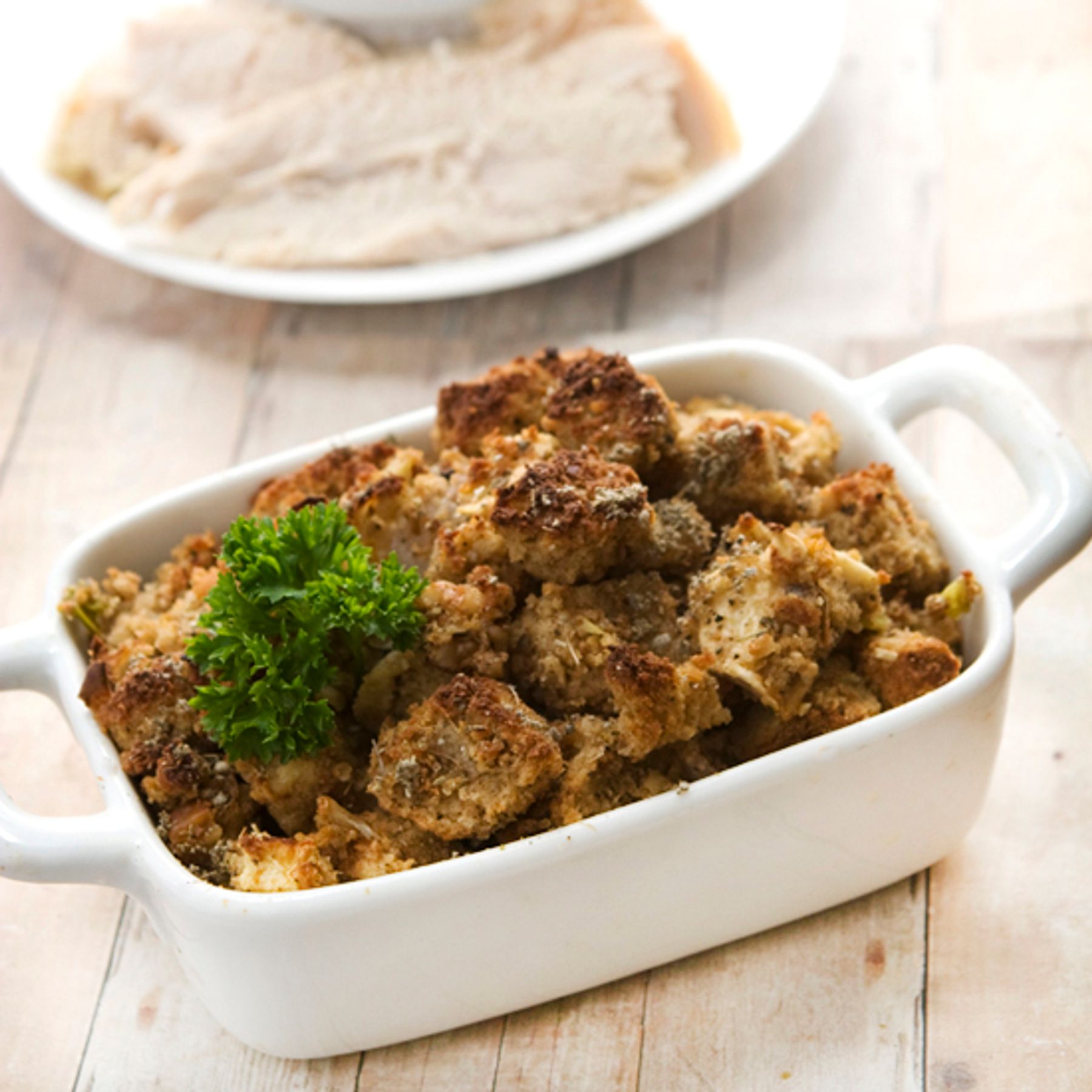 Moist & filling gluten free Thanksgiving stuffing for the whole family. Agave oat bread dressing, loaded with savory sage, walnuts and crisp apples.