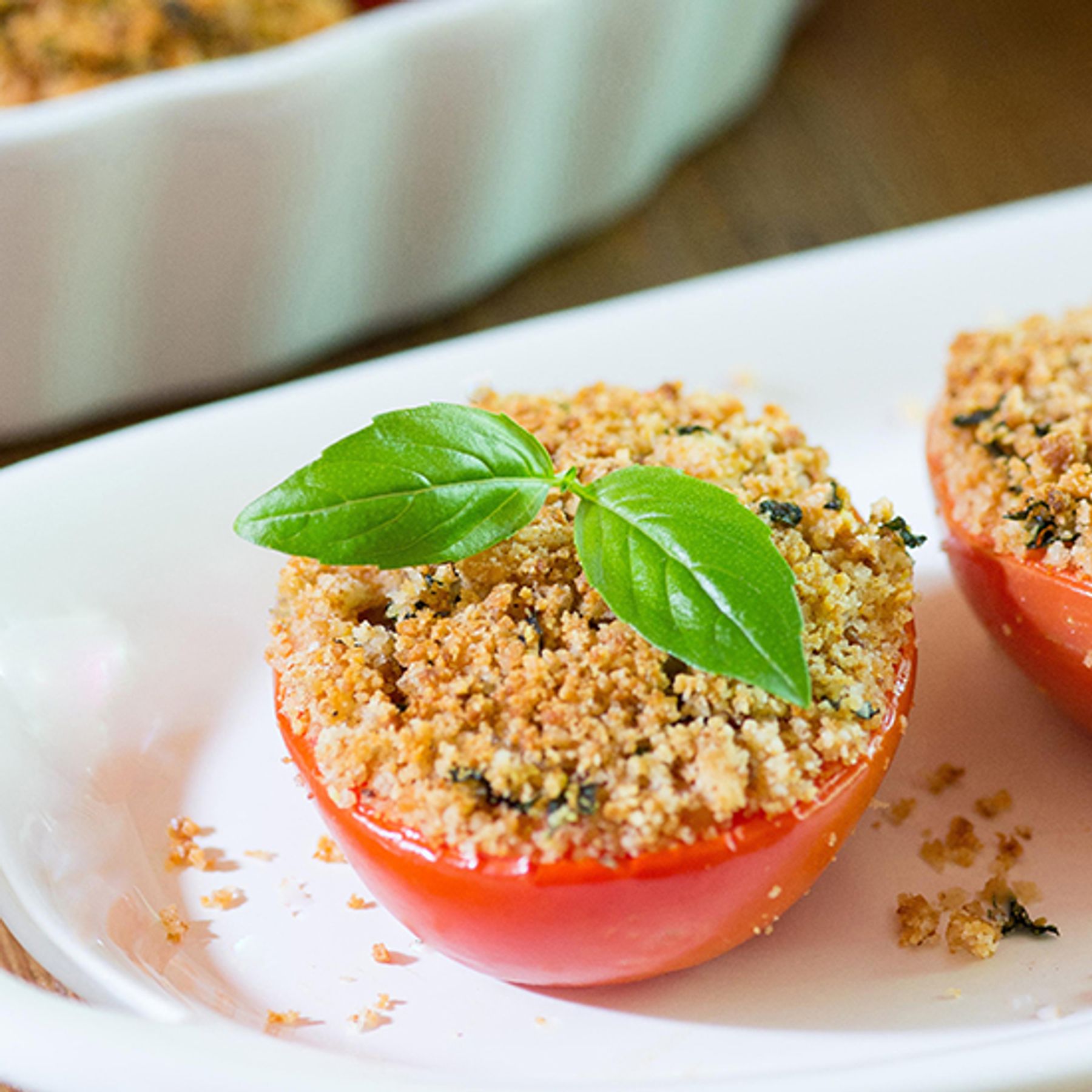 Gluten Free Tomatoes Provencal – a classic side dish made gluten free. Quick and easy. Stuffed with goat cheese and pine nuts. Great for entertaining or casual family dinners.