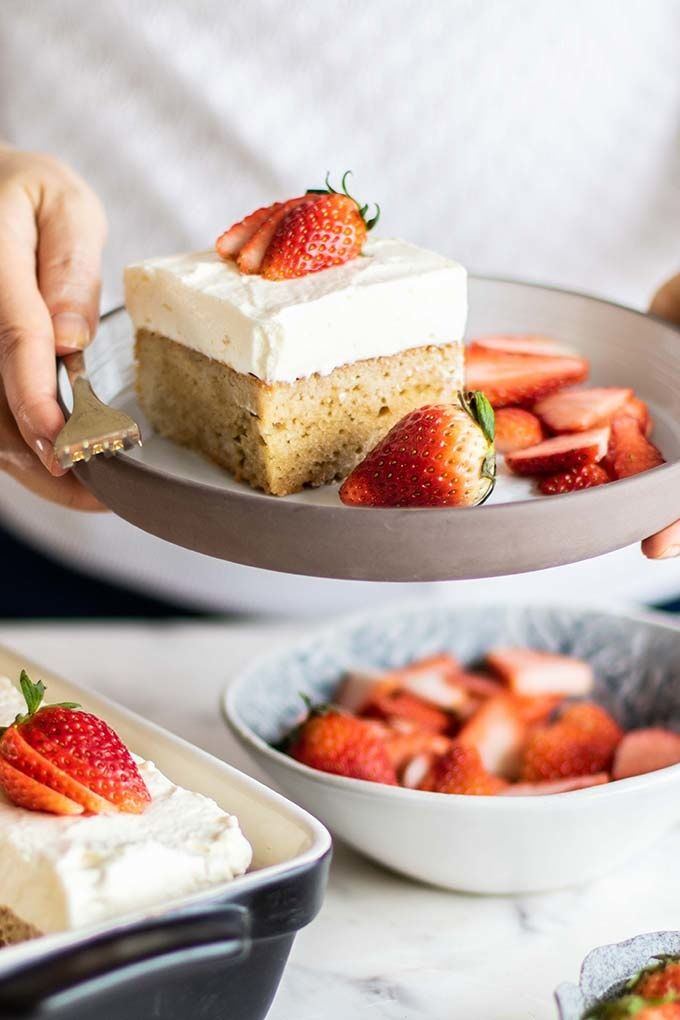 A dairy free and gluten free Tres Leches Cake, perfect for a spring gathering! This healthier Tres Leches is made with a fluffy almond flour cake and is soaked in a lightly sweetened coconut milk, and then topped with fluffy coconut whipped cream. Serve with strawberries for a light and elegant dessert.