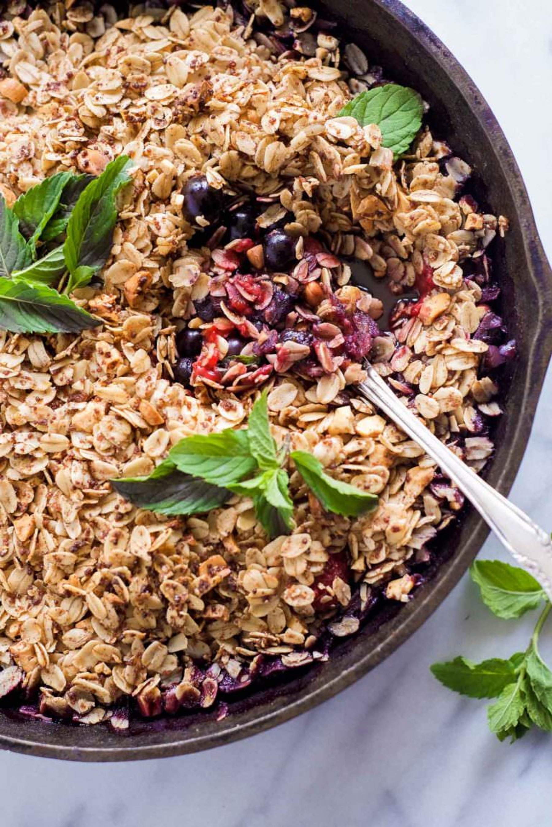 Gluten Free Vanilla Triple Berry Crisp is a simple 8 ingredient dessert that is bursting with fresh berries that bake into a juicy sauce; then topped with a sugary oatmeal topping. A gluten free and vegan dessert that is healthy enough for a breakfast treat!
