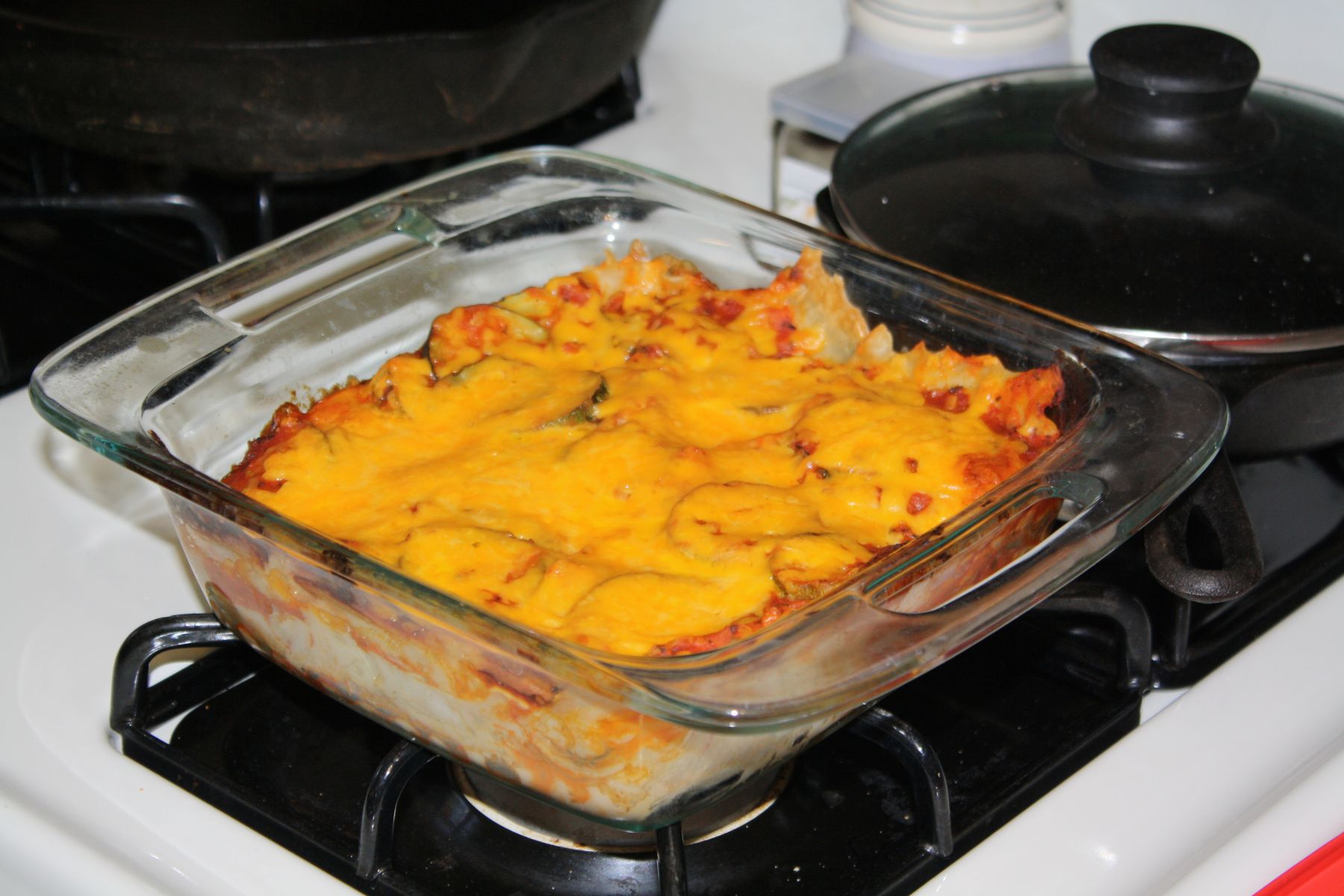 Cook noodles and drain and set aside. Chop peeled eggplant in even pieces. Cook in fry pan until tender. Chop up squash, zucchini, and onion and garlic.