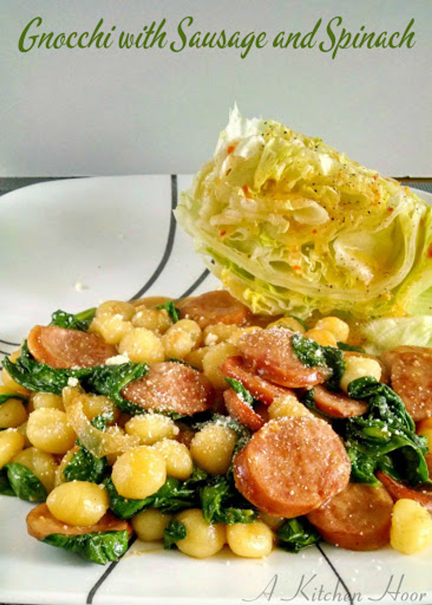 Hillshire Farm American Craft links are the perfect meat for this gnocchi and sauteed spinach meal.