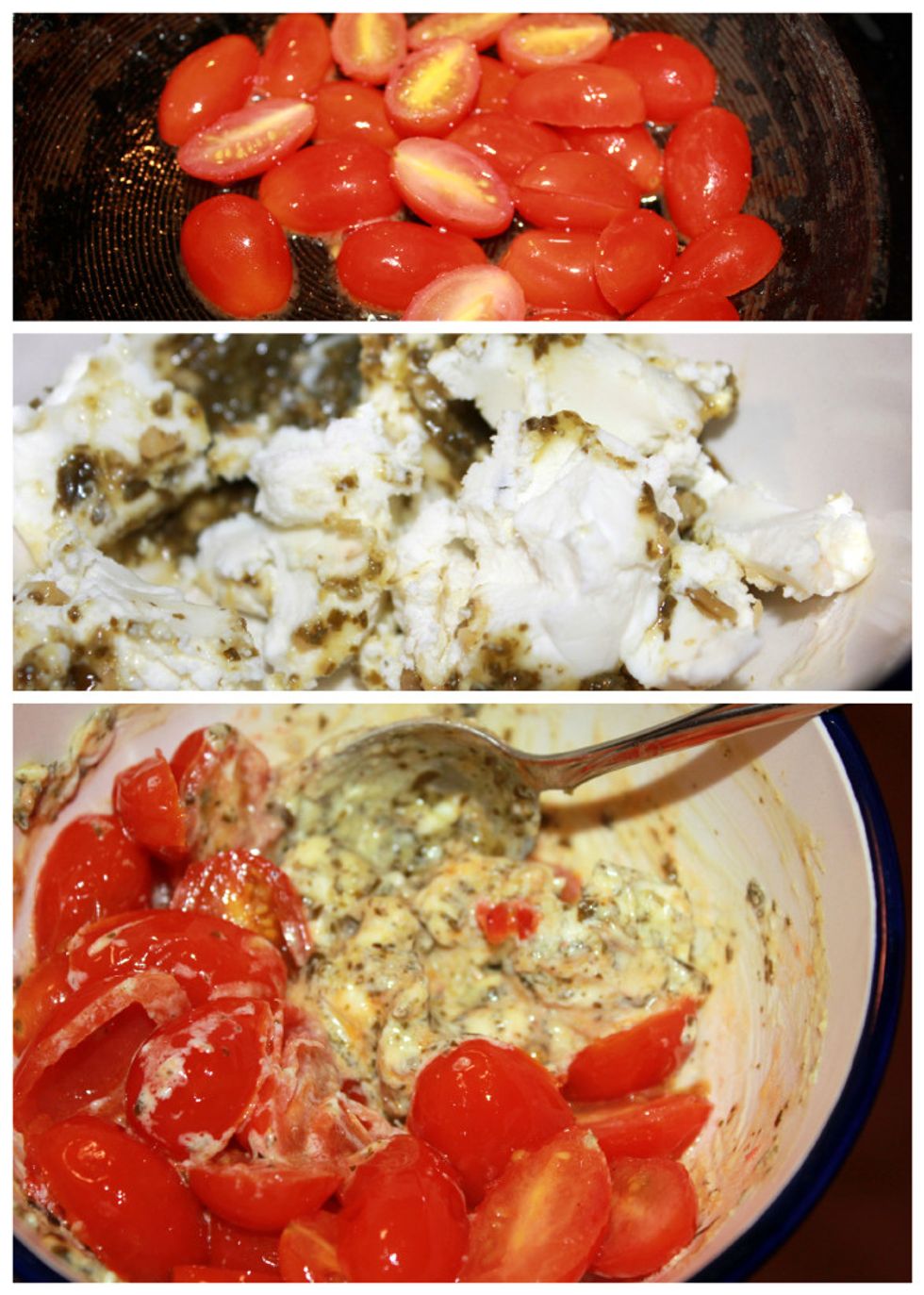 Heat olive oil on medium heat. Toss in sliced tomatoes until they are soft about 4 minutes. While the tomatoes are cooking combine goat cheese and pesto in a bowl. Once the tomatoes are done pour them into...