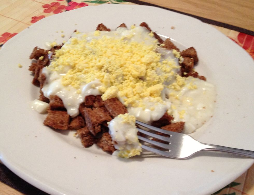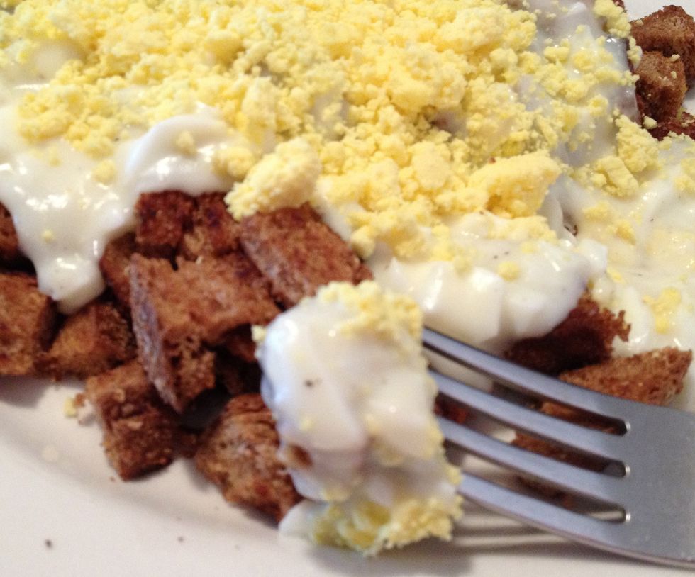 2. Separate the yolks and whites. Chop the whites fine and in a bowl, crush the yolks to a powder.