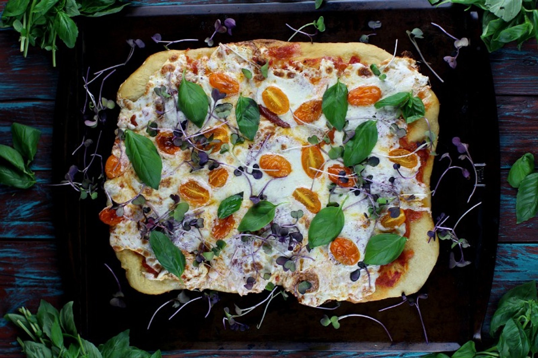 A delicious blend of fresh mozzarella, juicy golden tomatoes, pepperoni and basil make this Golden Tomatoes Pepperoni Pizza perfect for pizza night.