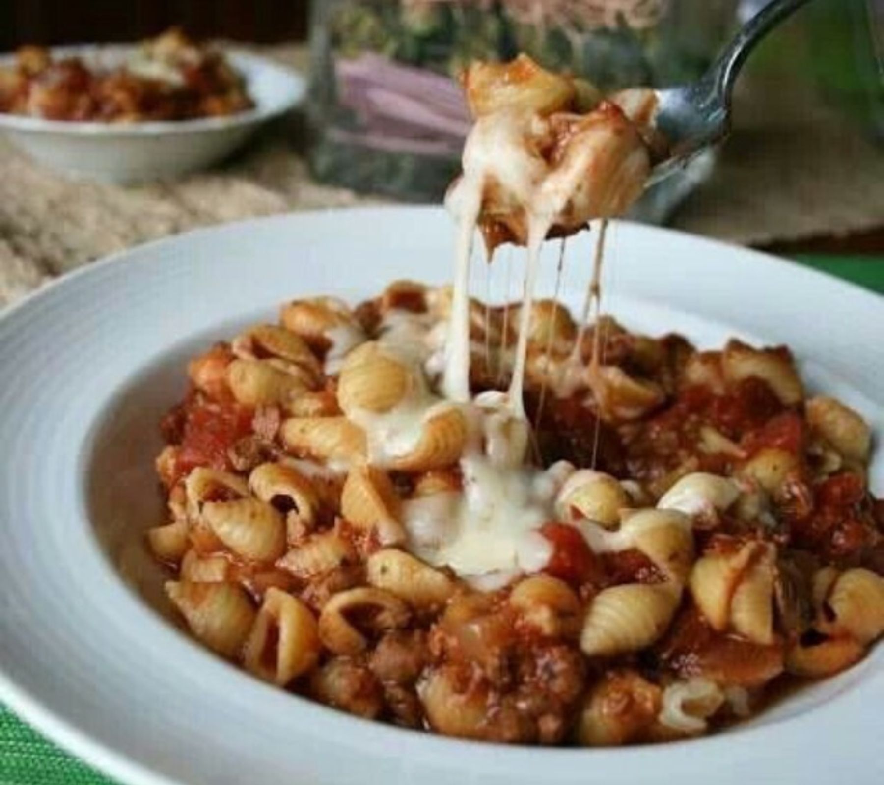 Creamy she'll noodles in rich red meaty sauce! Yumm!