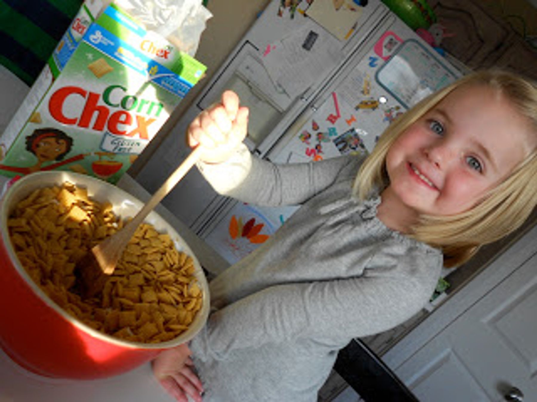 This recipe was a staple in our house every holiday season while we were growing up- a couple of years ago I even made about 10 batches of it and took it around to our neighbors as a Christmas gift. It is easy to throw together, the kids can help make it, and it is finished and ready to eat in less than 15 minutes. Warning: it\'s super addicting! I have absolutely no control when I make this . . . I just can\'t stop nibbling. :) I even had it for breakfast this morning . . . it\'s cereal, righ