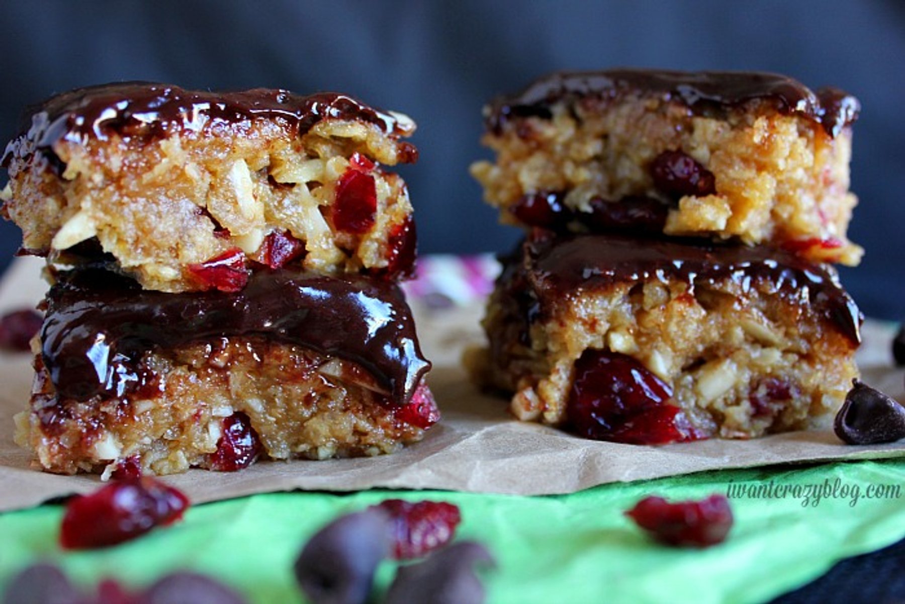 gooey oatmeal bars packed with dried cranberries and topped with a chocolate ganache