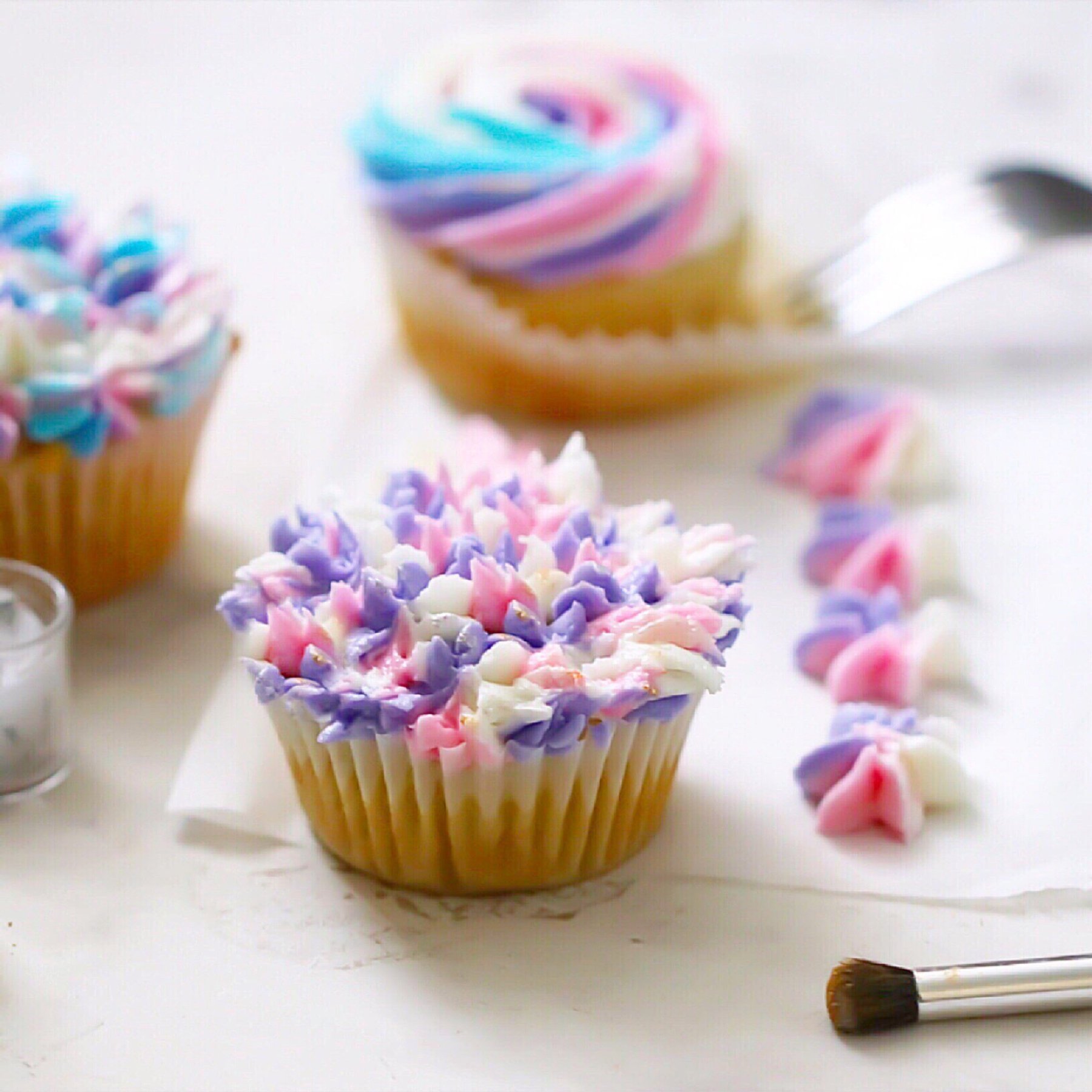 Delicious grain-free + vegan vanilla cupcake recipe. Decorating tips included!