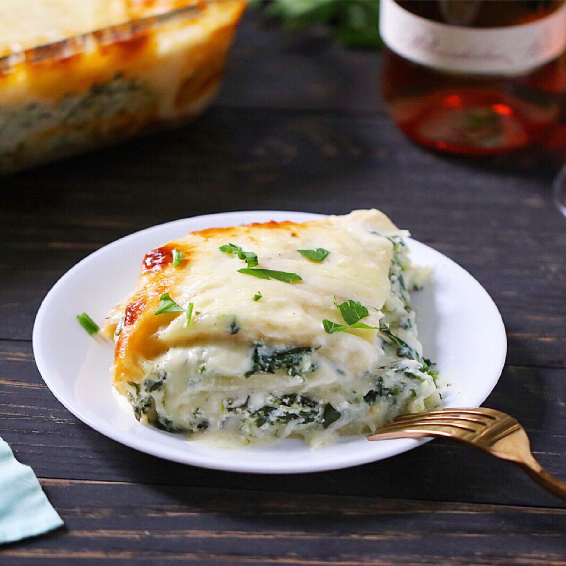 Delicious and cheesy grain-free spinach lasagna with white sauce.