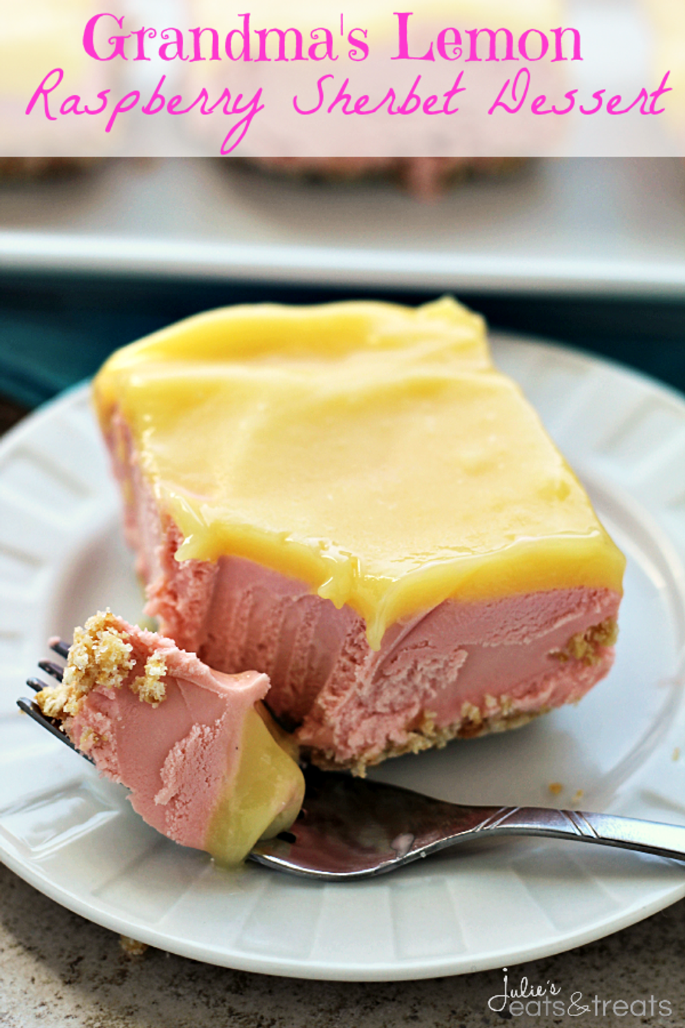 Grandma’s Lemon Raspberry Sherbet Dessert ~ Salty Crust Topped with Creamy Raspberry Filling and a Tart Lemon Topping!