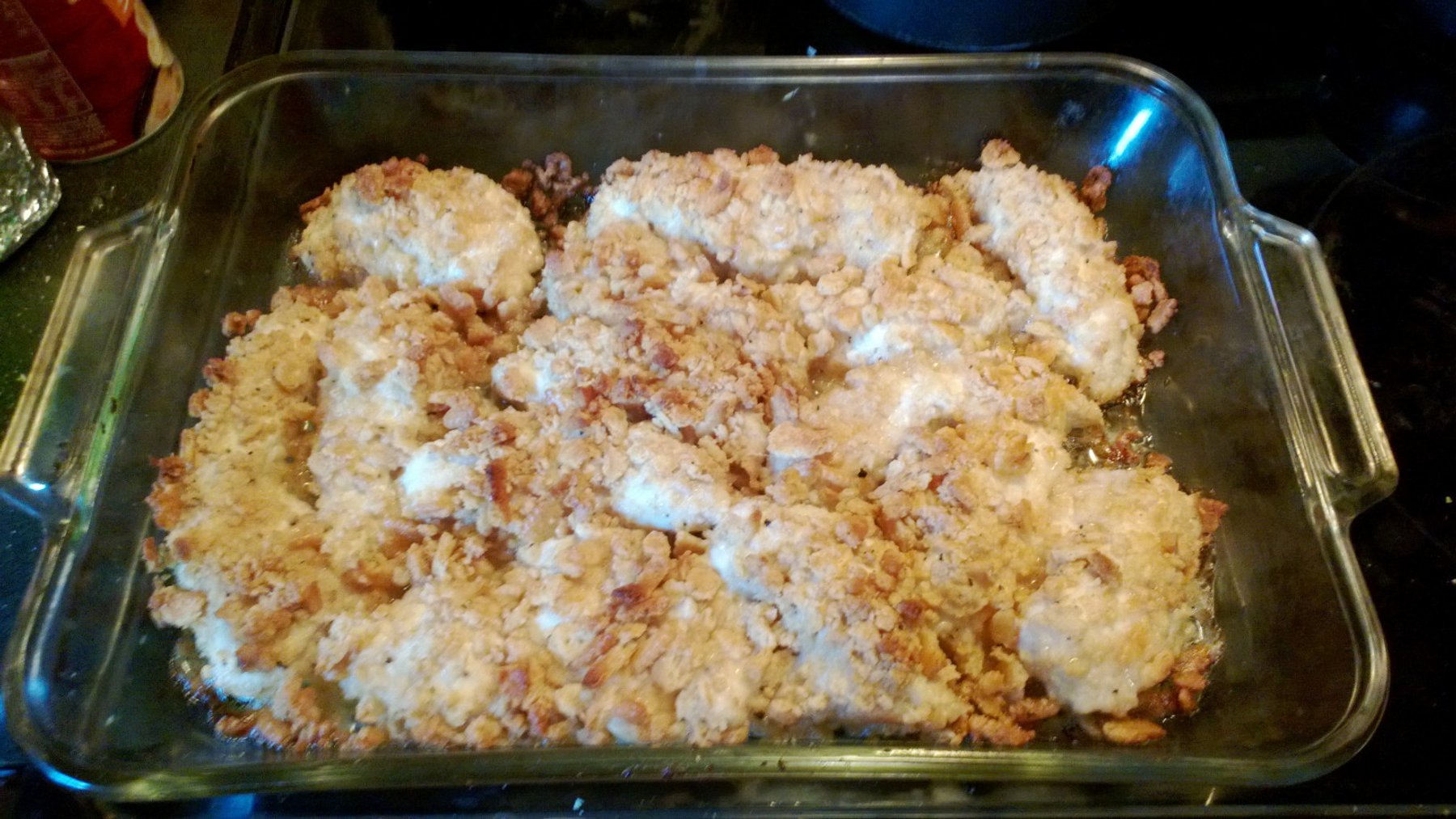 Coat each piece of chicken well with the Ritz cracker mixture, and place in medium sized baking pan.