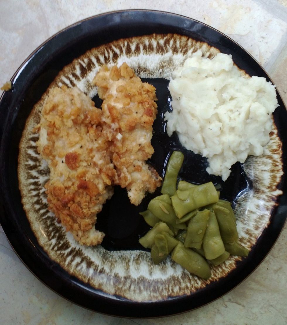 Coat each piece of chicken well with the Ritz cracker mixture, and place in medium sized baking pan.