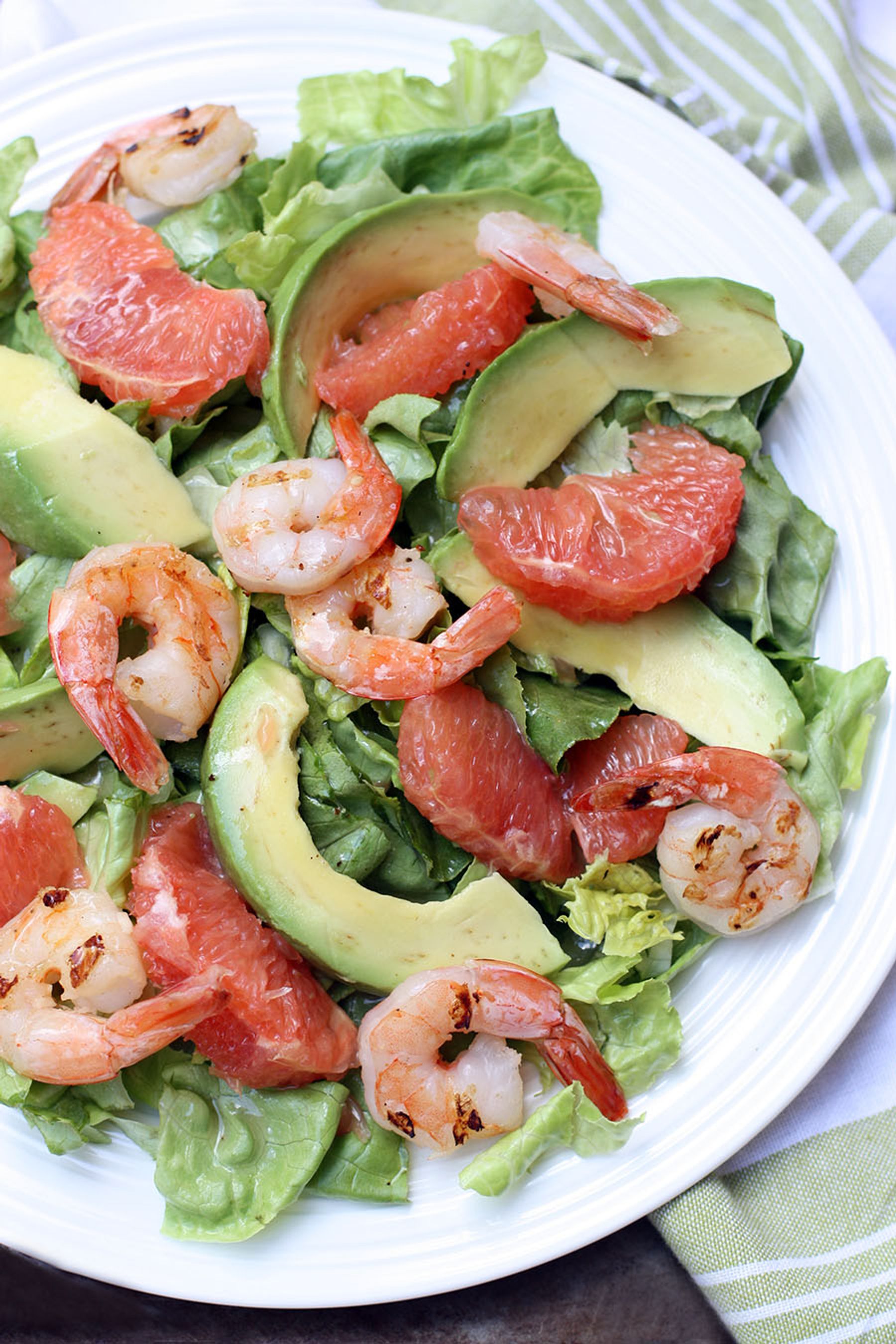 Grapefruit and Avocado Salad with pan seared shrimp and a delicious sweet lemon dressing.