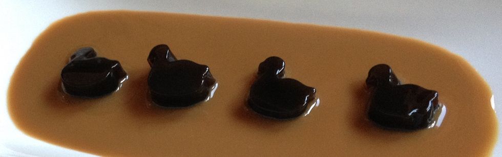 Put the jelly pieces in the plates, and pour the latté sauce over them.