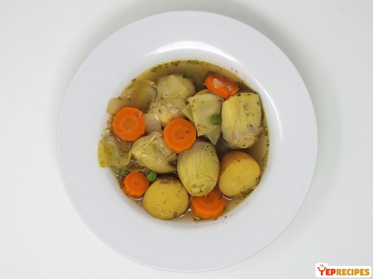 A light Greek style vegetable stew made with artichokes, onion, carrots, potatoes, and peas.
