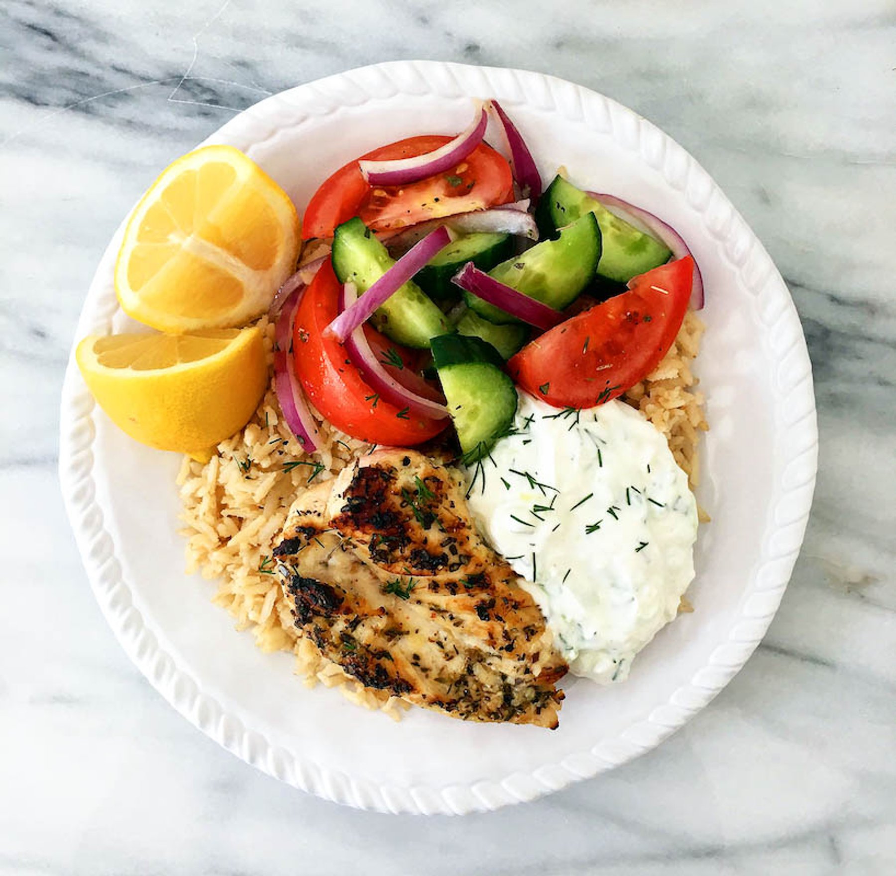 Simple Greek Grilled Chicken Rice Bowl served with a fresh and vibrant salad and delicious tzatziki!