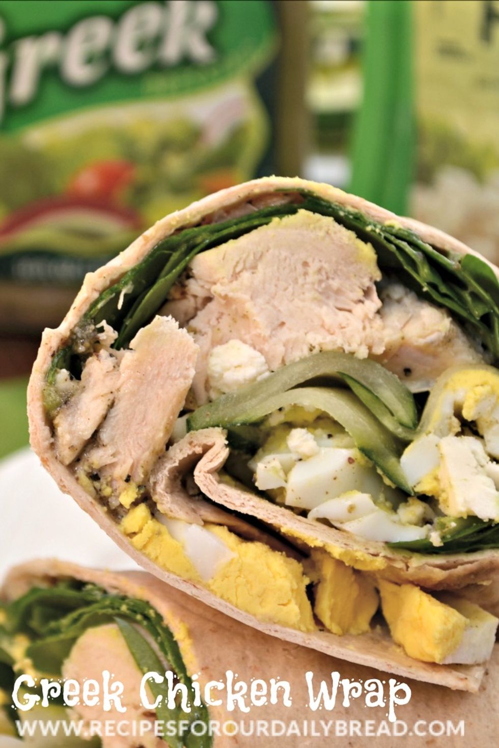 Sprinkle the chicken WELL with Greek seasoning and bake it. 350 degrees for 30 minutes. Spread a couple of tablespoon of Greek dressing on the bottom of each wrap. Add fresh spinach on top of the Greek...