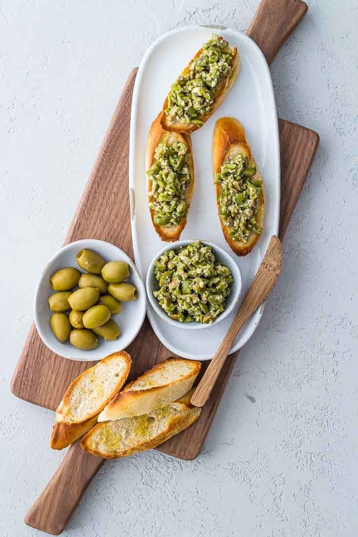 Greek Green Olive Crostini is an easy and quick party appetizer for any occasion. With just a few ingredients you can surprise your guests with a tasty party bite. These crostini are made with toasted baguettes, crushed Chalkidiki Greek green olives, grated Parmigiano-Reggiano, Greek extra virgin olive oil, and chopped garlic.