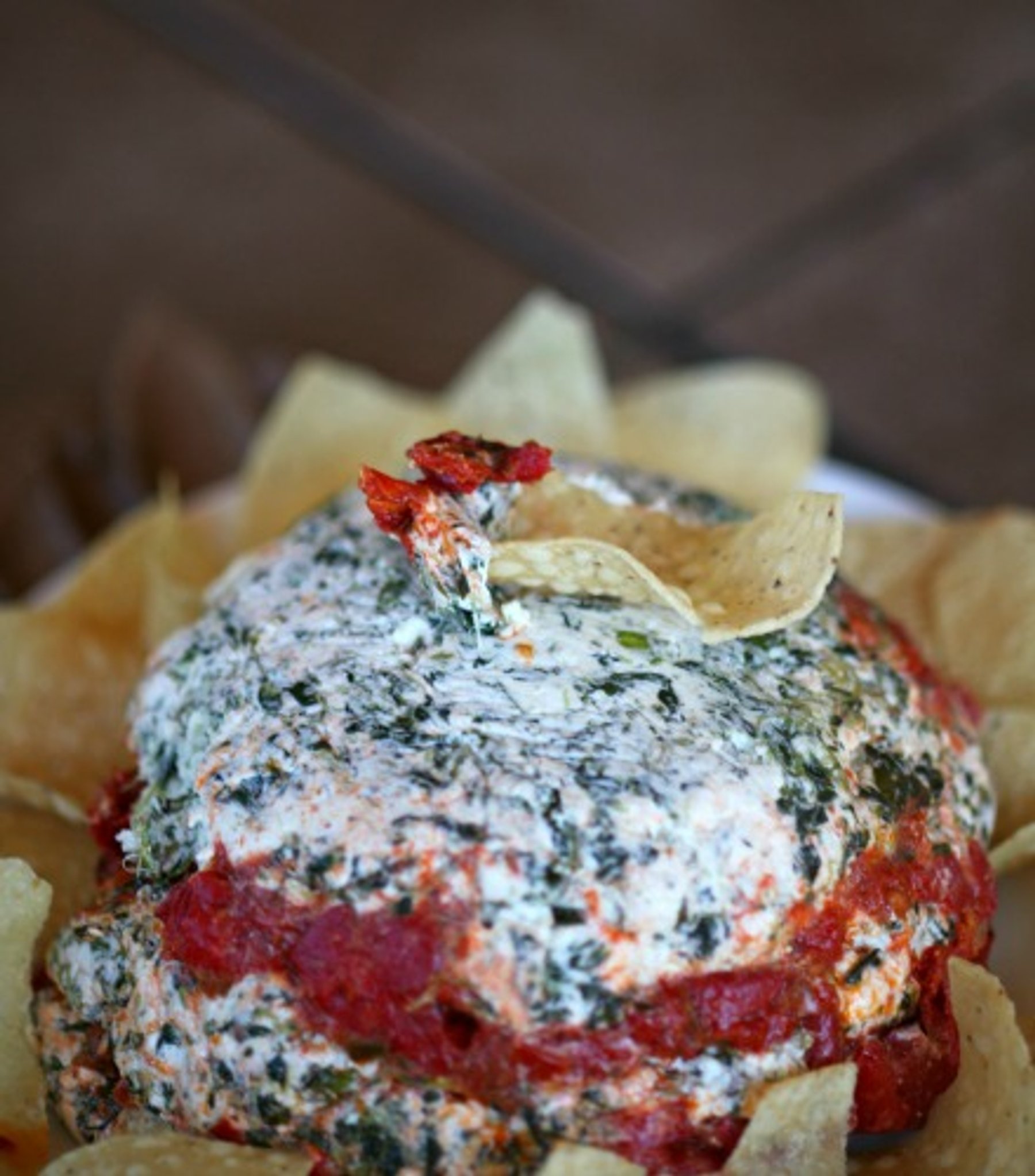 A cream cheese dip layered with Greek flavors and roasted red peppers and sundried tomatoes.