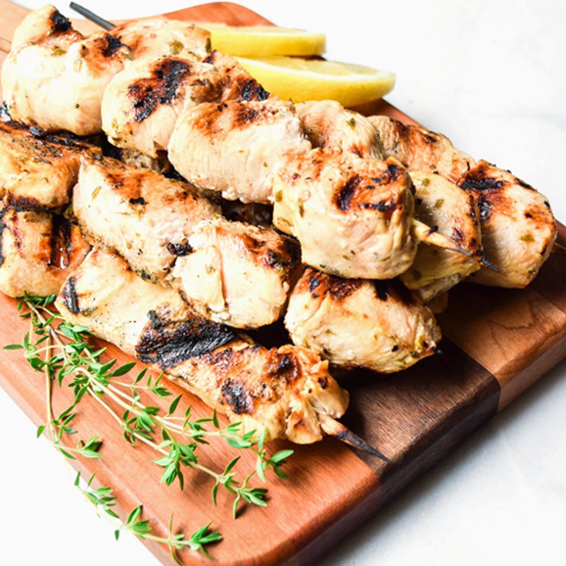 Main Dishes Greek Lemon Chicken Skewers Nikki BehnkeJune 07, 2016 34 Combine fresh lemon juice, olive oil, Dijon, honey, oregano, thyme, and salt.See the full directions on my site Low-CarbohydrateLow-FatGluten-Free