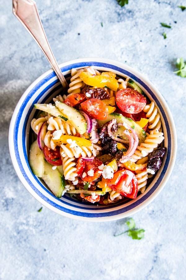 Greek Pasta Salad is a delicious side dish you can make in no time at all - and it can be prepped ahead. Just grab a fork and dig in - yum!