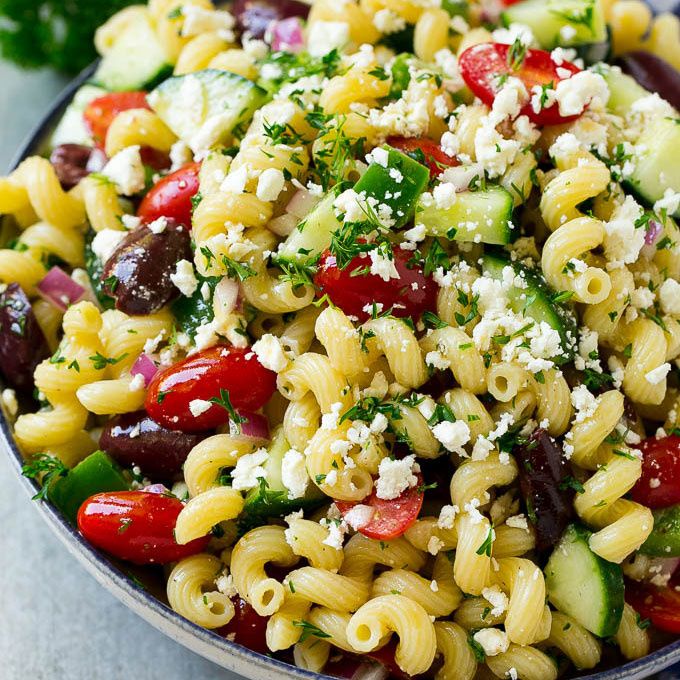This Greek pasta salad is a light and fresh combination of colorful veggies, olives, and feta cheese.