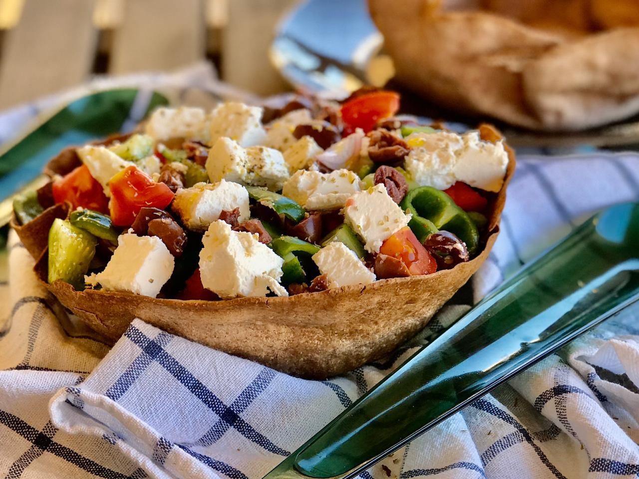 Greek salad is one of the most popular and loved Greek dishes. Having Greek salad in a tortilla bowl is super convenient, where you just eat the whole thing. In addition, this dish provides you with an adequate intake of veggie, protein and carbs in one shot.