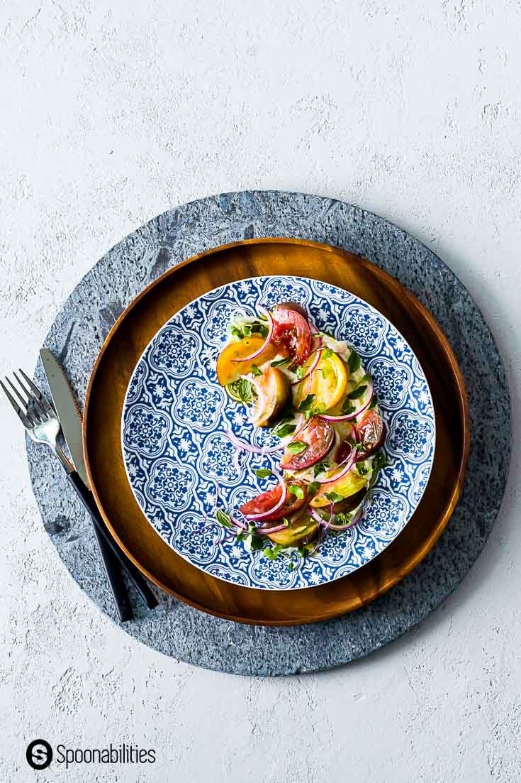 From a traditional Greek salad, we are elevating the presentation with heirloom tomatoes lying on top of a creamy feta mousse, thinly sliced red onions, and Hellenic Farms Greek kalamata olives. Give the finishing touches with fresh herbs, a drizzle of high quality Greek extra virgin olive oil, and a sprinkle of Sea Salt Fleur De Sel.