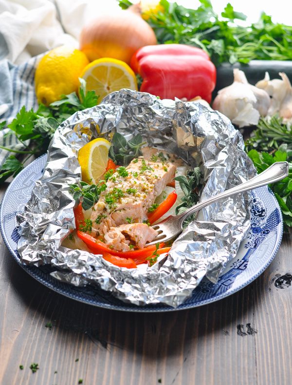 This healthy Greek Salmon Baked in Foil is an easy dinner recipe that's ready in 30 minutes! The fish and vegetables cook together in disposable packets with lemon, garlic and herbs for a convenient weeknight meal and almost no cleanup!