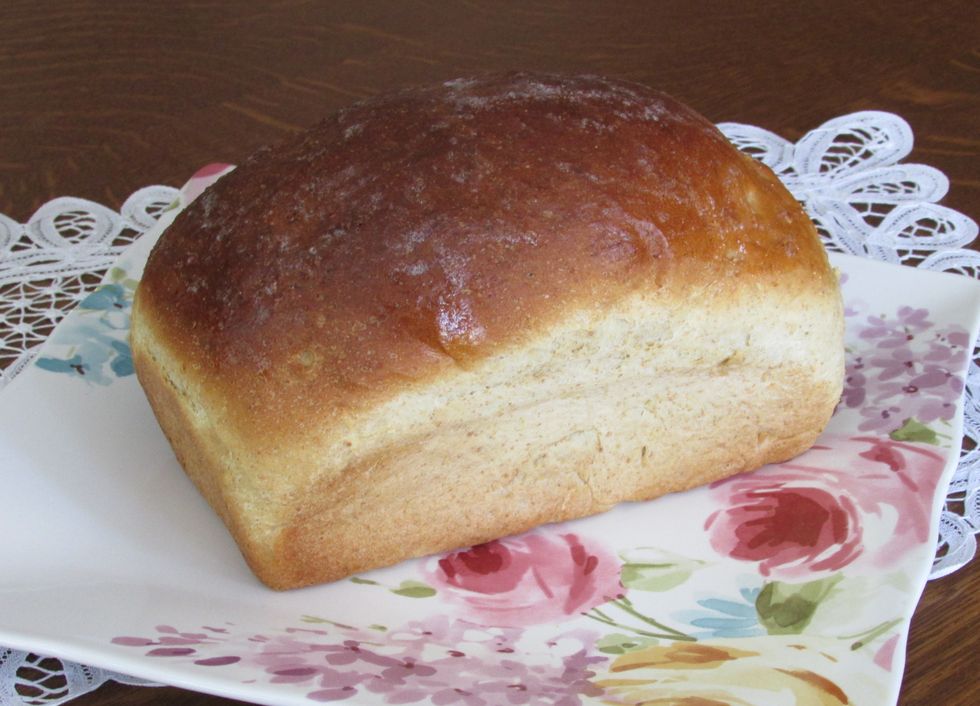 After the dough cycle is complete (mine takes an hour and a half) take the dough out, shape into a loaf and place in a bread pan. (This makes a very large loaf- I usually make it into two half-size loaves* and give one away!.) Allow to rise for an additional 1 and 1/2 hours, until dough is higher than the sides of the pan.