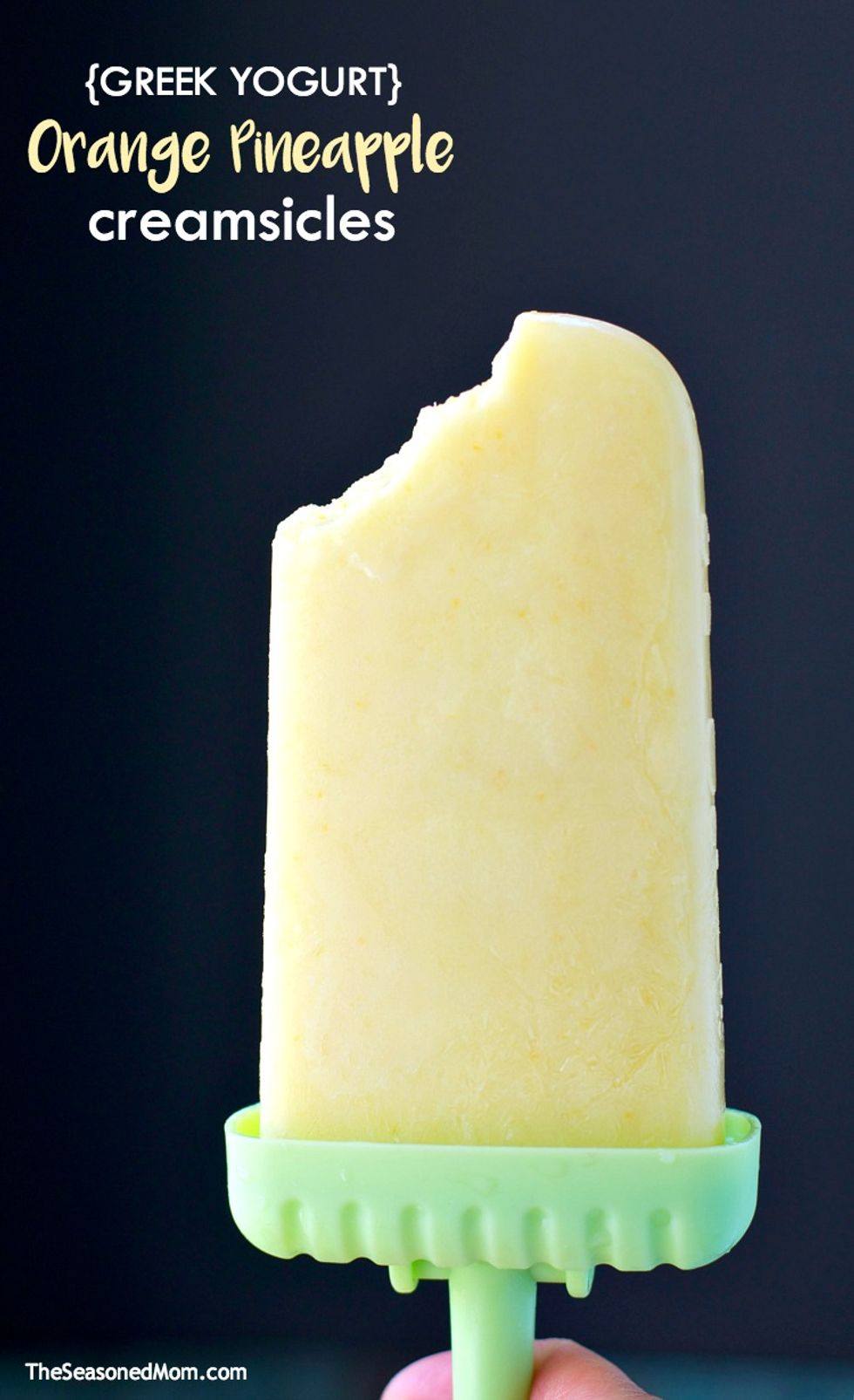 For about 40 calories you can enjoy these cool and creamy Greek Yogurt Orange Pineapple Creamsicles that are bursting with tropical citrus flavor! And with no added sugar, the homemade popsicles are healthy enough to eat for breakfast, snack or dessert!