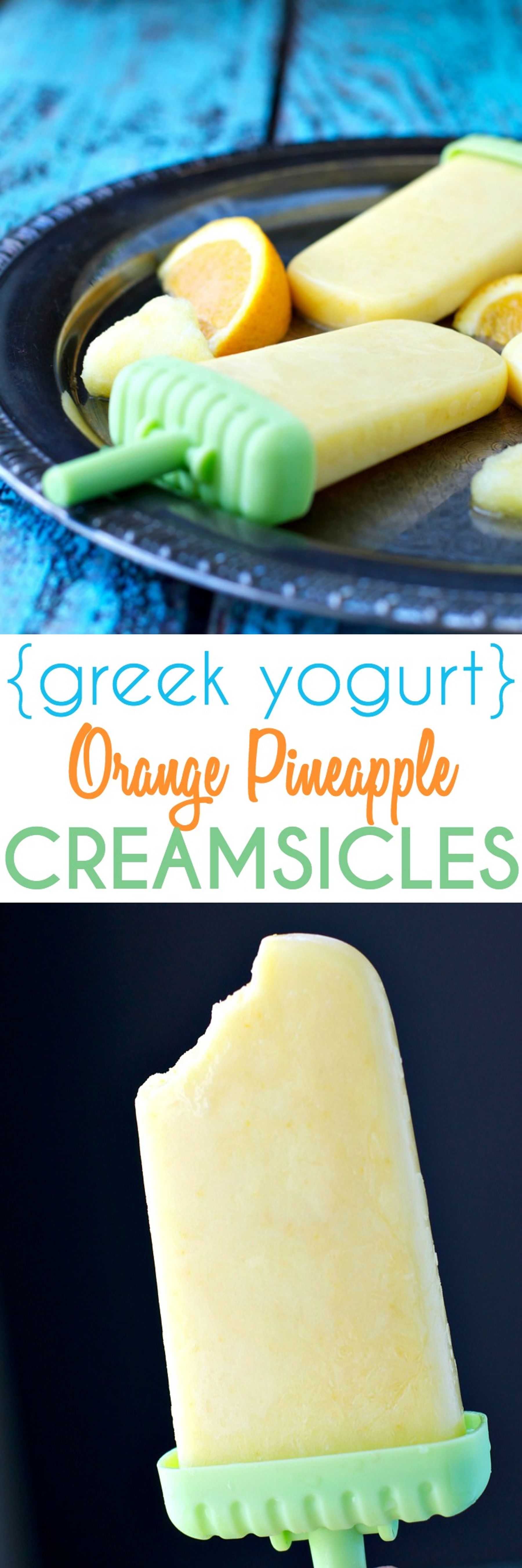 For about 40 calories you can enjoy these cool and creamy Greek Yogurt Orange Pineapple Creamsicles that are bursting with tropical citrus flavor! And with no added sugar, the homemade popsicles are healthy enough to eat for breakfast, snack or dessert!
