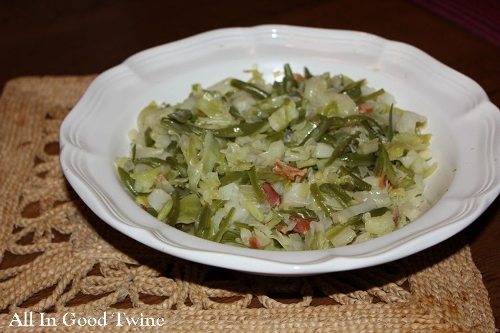 Cook bacon in large skillet. Crumble and set aside. Add onion to bacon drippings and cook until soft. Add frozen grean beans. Cook and stir frequently until hot. Stir in cabbage. Put lid on and cook, stirring occasionally until beans and cabbage is tender. Season with salt and pepper. Stir in crumbled bacon. Serve and enjoy!