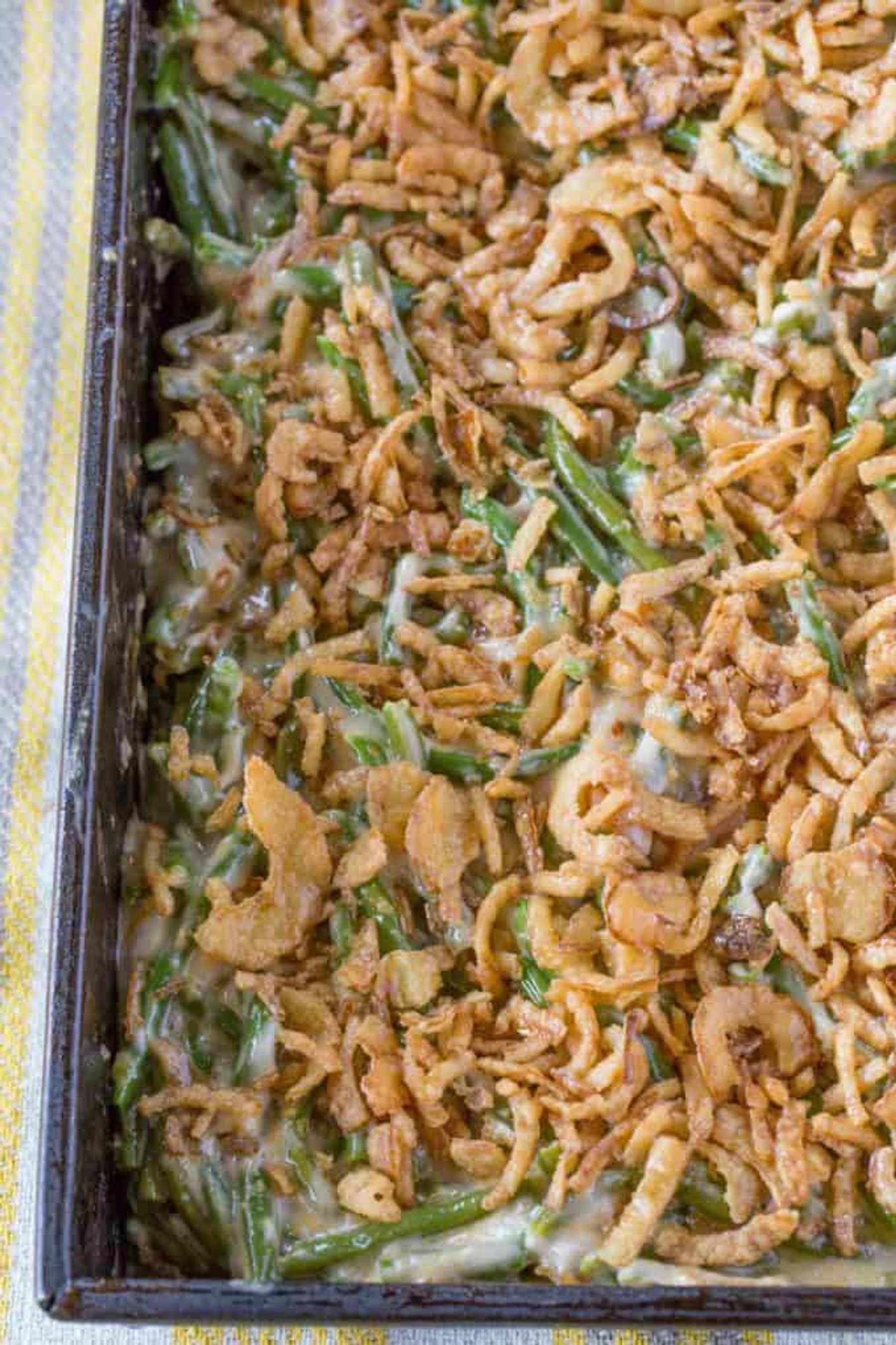 Easy Green Bean Casserole with green beans, mushroom soup, cheese and fried onions with just 5 minutes of prep. You'll never go back to the canned stuff.