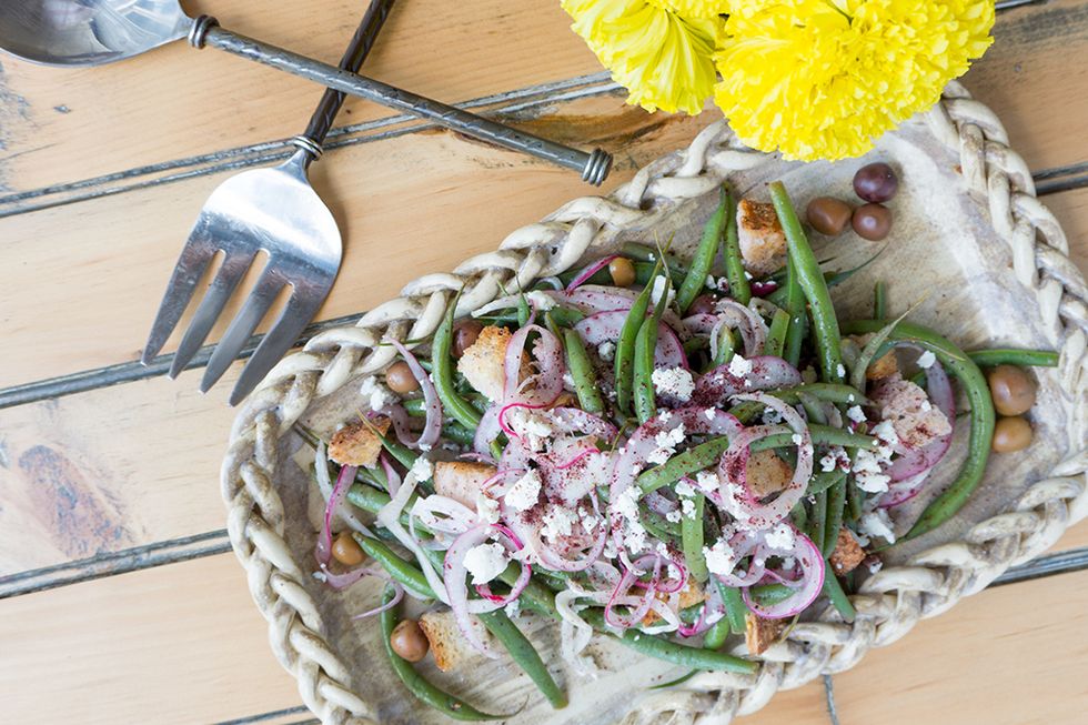 Fresh greens beans are the star of this veggie bread salad. Packed with flavors from shaved fennel, paper thin red onion, olives, and feta! A Mediterranean delight!