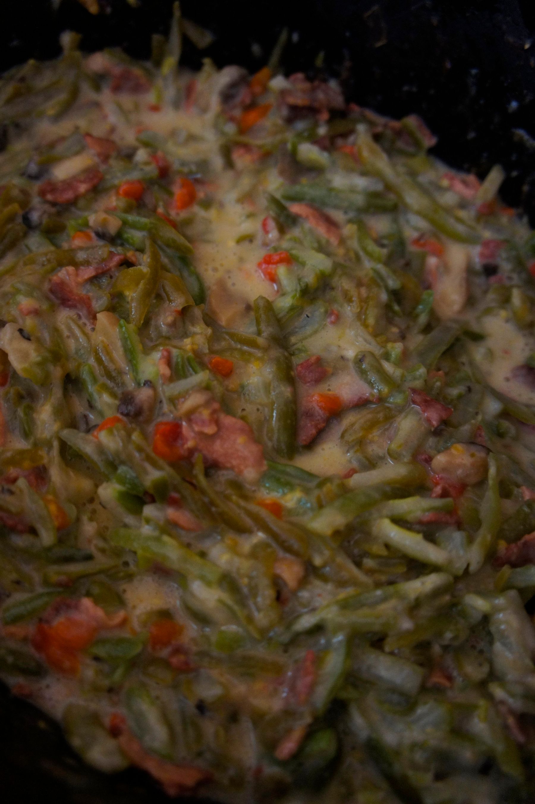 Spray crock pot with cooking spray. Combine all ingredients together and pour into crock pot. Cover and cook on low for 4-6 hours or until green beans are tender.