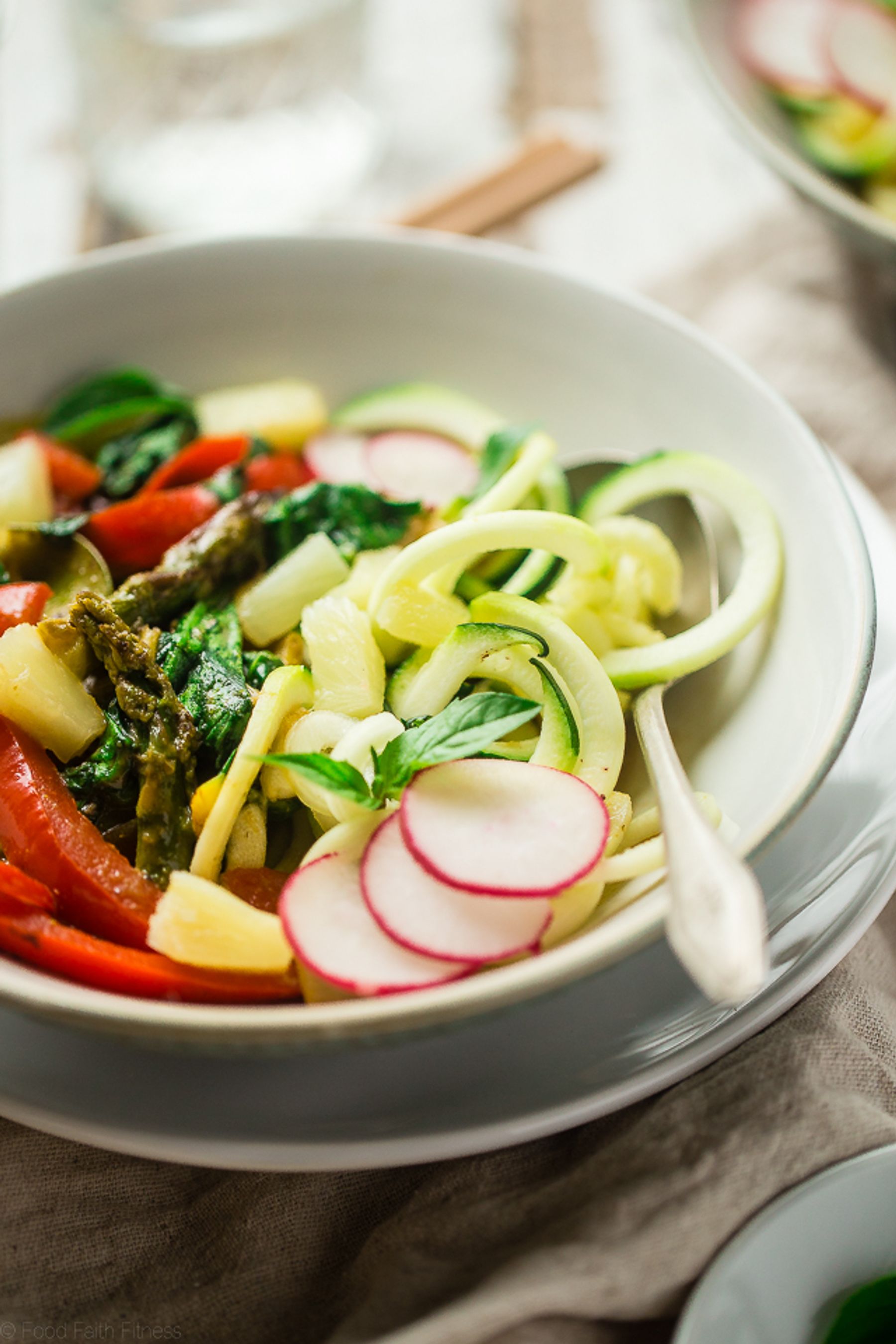 These easy, vegan and paleo-friendly bowls are made with pineapple, spring veggies, zucchini noodles and a creamy green coconut curry sauce! Perfect for Meatless Monday and only 250 calories!