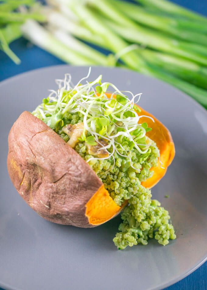 Stir together the green goddess dressing with the cooked quinoa, to taste. I use almost all of it because I like my quinoa saucy. Mix in the chopped walnuts. Slice open each sweet potato lengthwise....