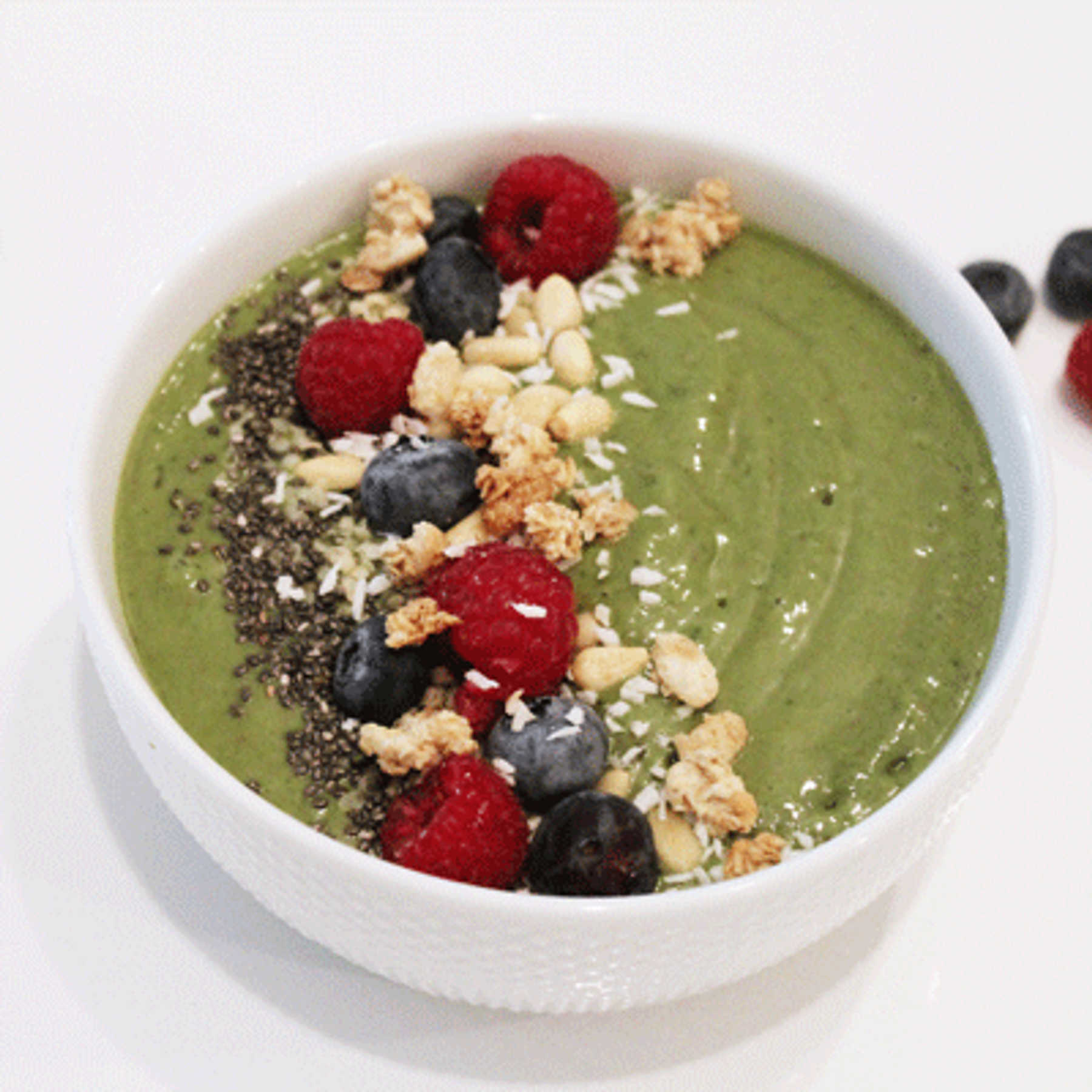 The Green Smoothie Bowl is packed with healthy ingredients, such as spinach greens, but also packs a strong protein punch with the toppings such as Chia Seeds and Pine Nuts.