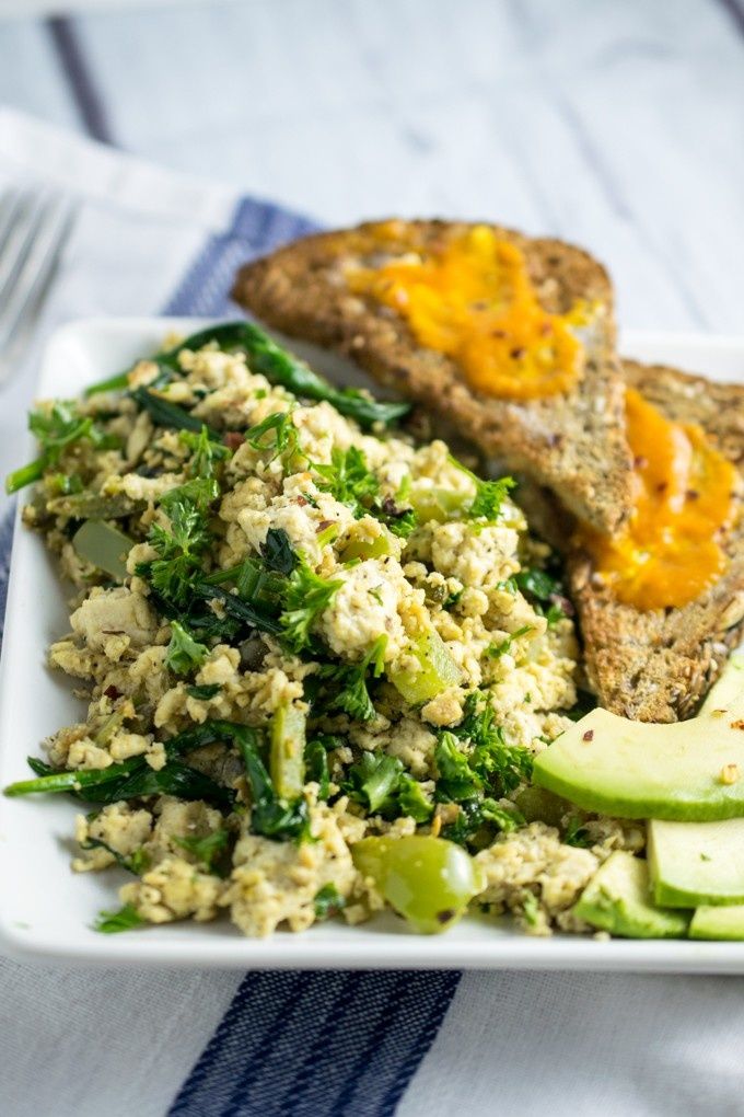 A green tofu scramble full of nutritious ingredients and a tasty tahini sauce!