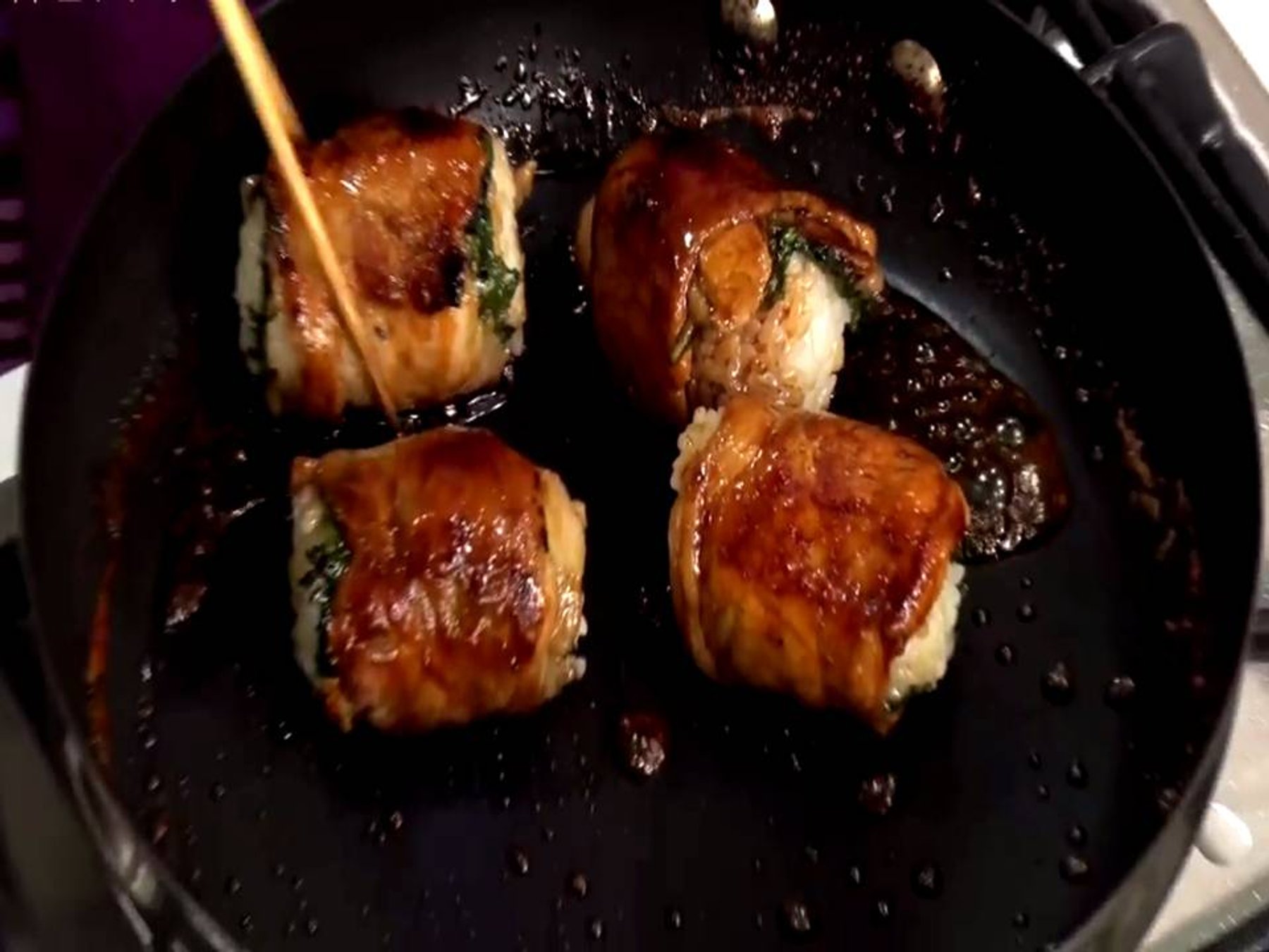 Simple rice ball wrapped by a thin slice pork loin, then grill on a hot pan and caramelized by soysauce.