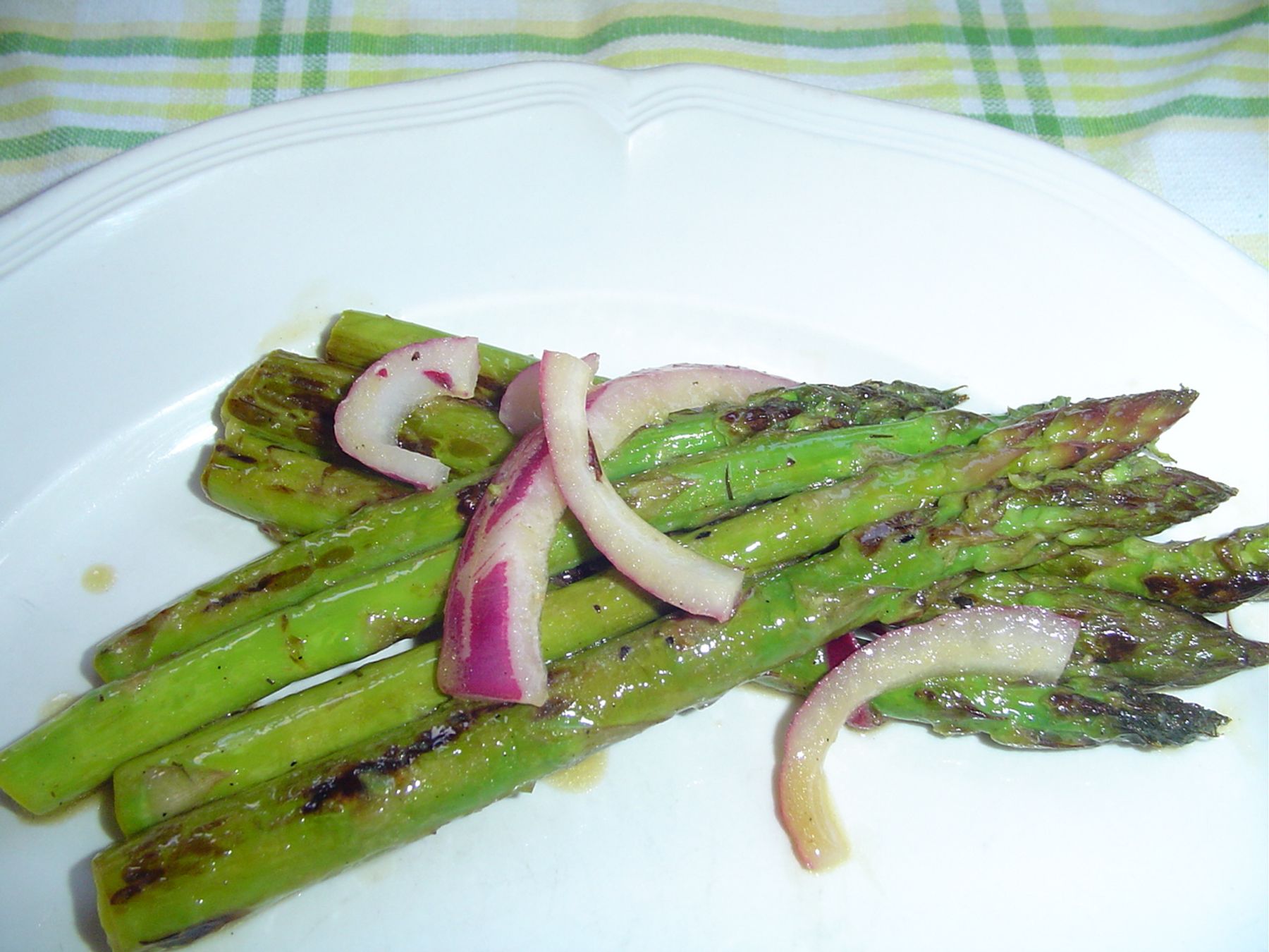 Trim the ends off of the asparagus and toss in a bowl with 1 tbsp of oil. Sprinkle with salt and pepper. Place on the grill. Meanwhile, cut 2 slices off of a large red onion and cut them into quarters. In...