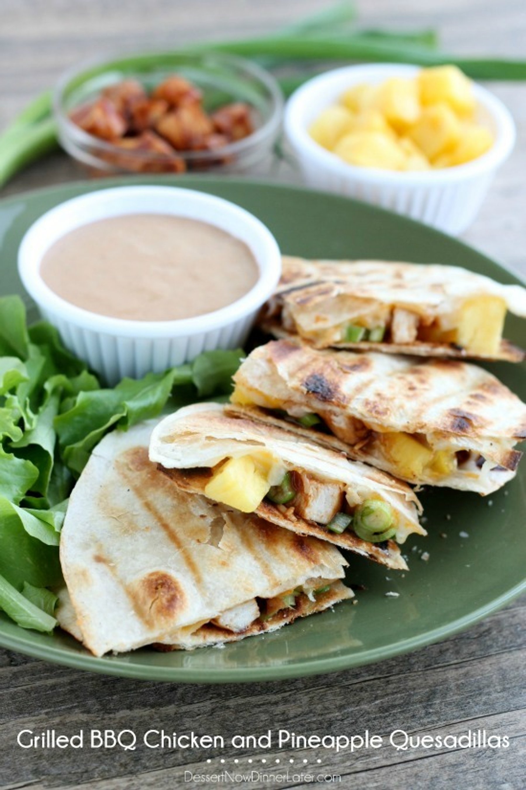 These grilled quesadillas are filled with saucy bbq chicken, mozzarella and cheddar cheese, fresh pineapple chunks, and sliced green onions. Toasty and delicious!
