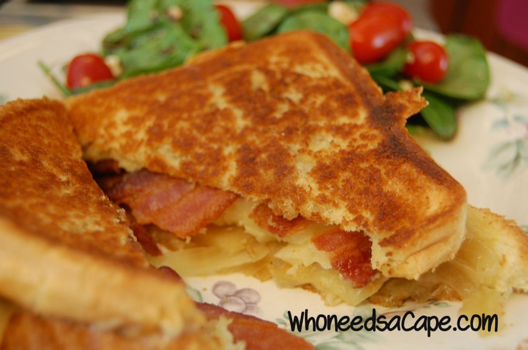On top of bread put down (In this order) Bacon, Cheese, Onions, Apples, Cheese, Bread with butter side up
