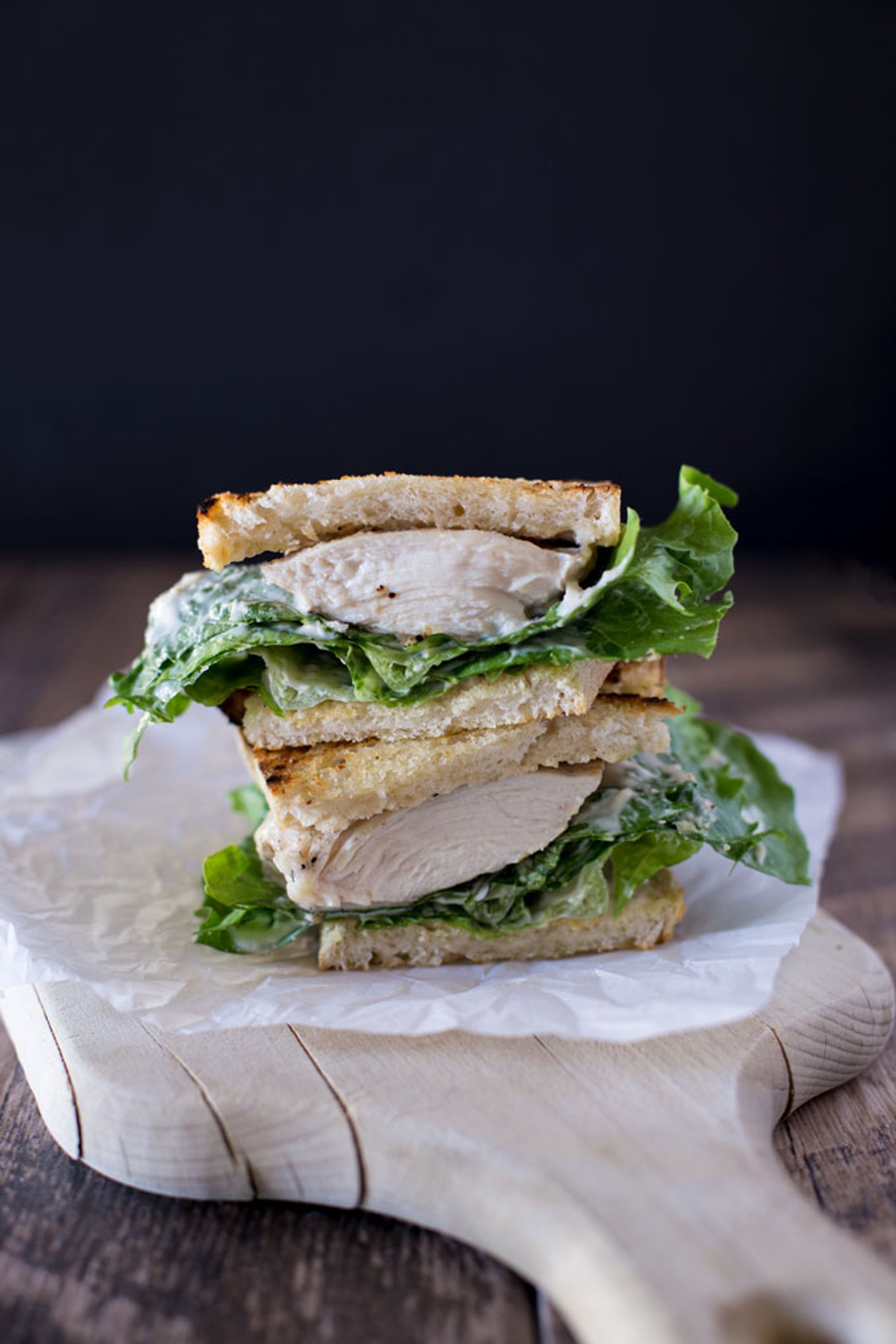 Grilled chicken Caesar sandwich. Grilled sourdough with a hint of olive oil, juicy, tender grilled chicken breast, surrounded by Caesar salad goodness.